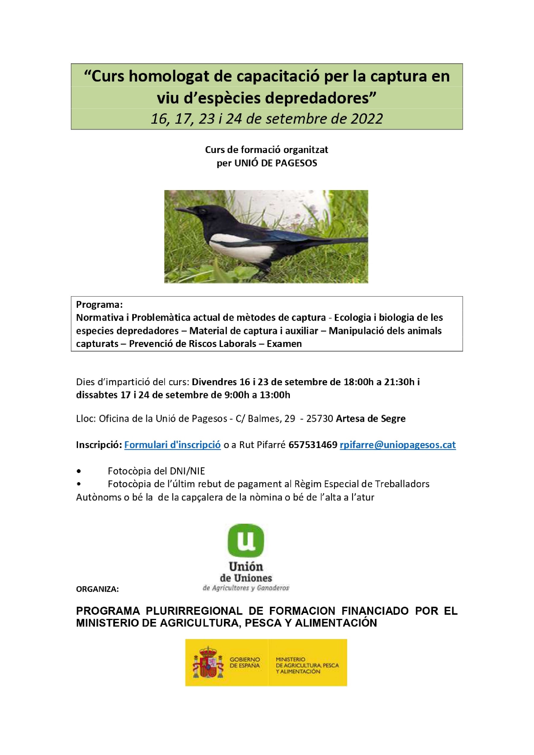 Obertes les inscripcions per al curs homologat de capacitació per la captura en viu d'espècies depredadores que es realitzarà des del dia 16 de setembre a Artesa de Segre