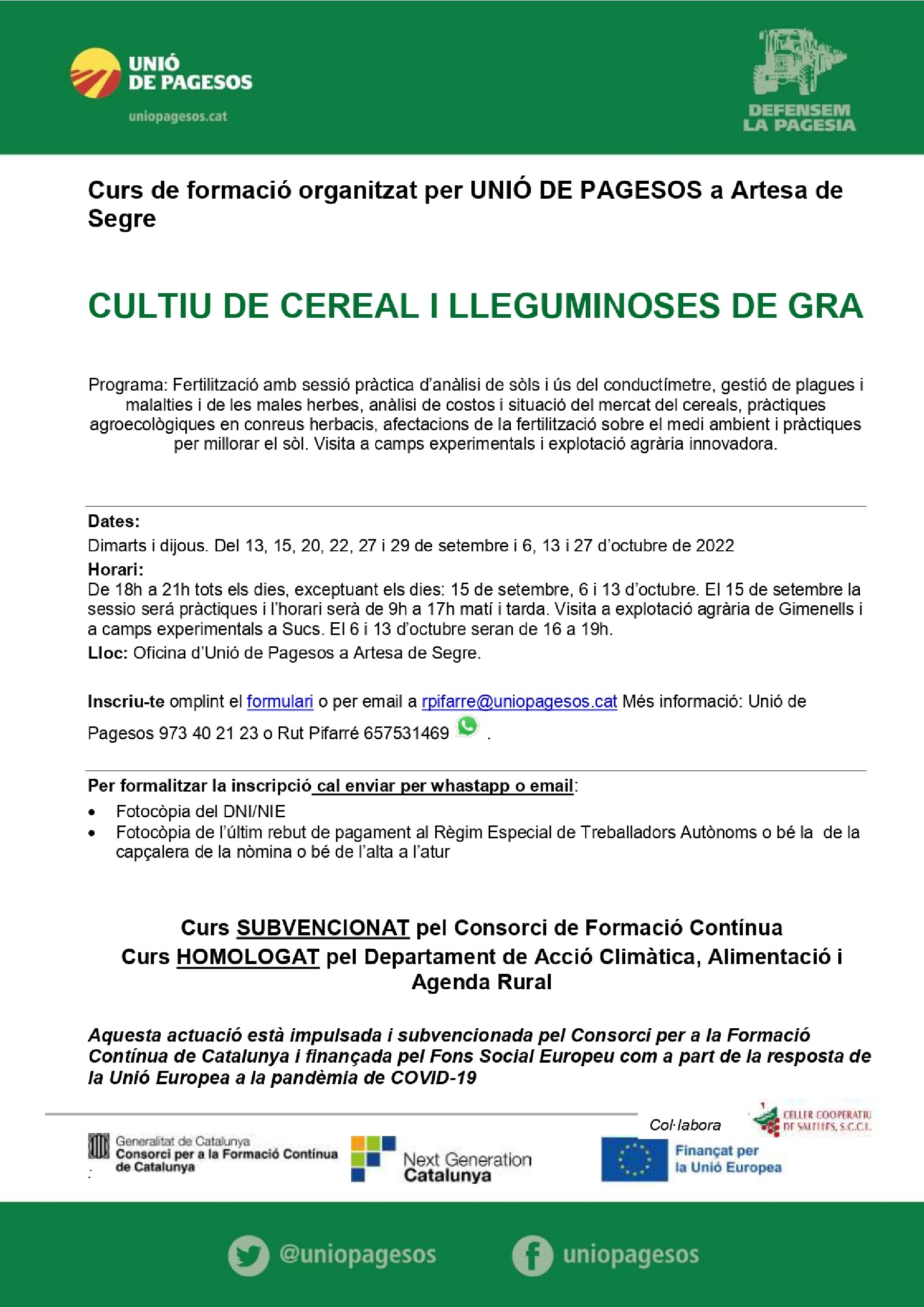 Unió de Pagesos obre les inscripcions per al CURS de CULTIU DE CEREAL I LLEGUMINOSES DE GRA, que tindrà lloc a Artesa de Segre durant els mesos de setembre i octubre