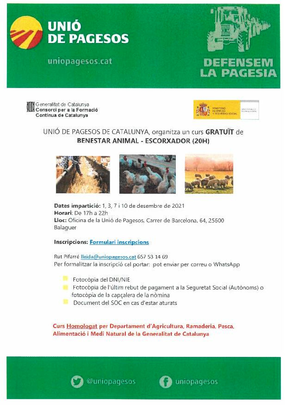 Unió de Pagesos de Catalunya organitza de l'1 al 10 de desembre un curs gratuït de benestar animal escorxador. Es durà a terme de forma presencial a l'Oficina de la Unió de Pagesos de Balaguer