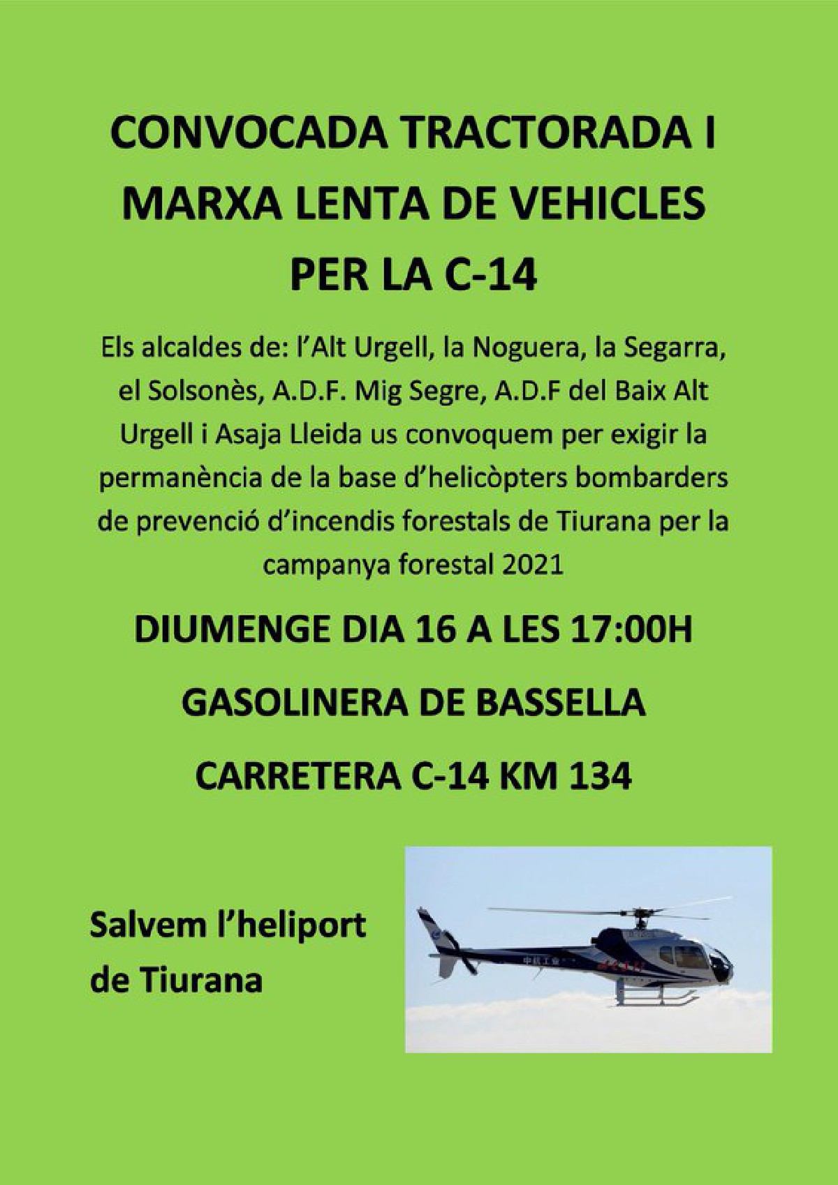 ASAJA Lleida convoca una marxa lenta a la carretera C14 a Basella per exigir la permanència de l'heliport de Tiurana