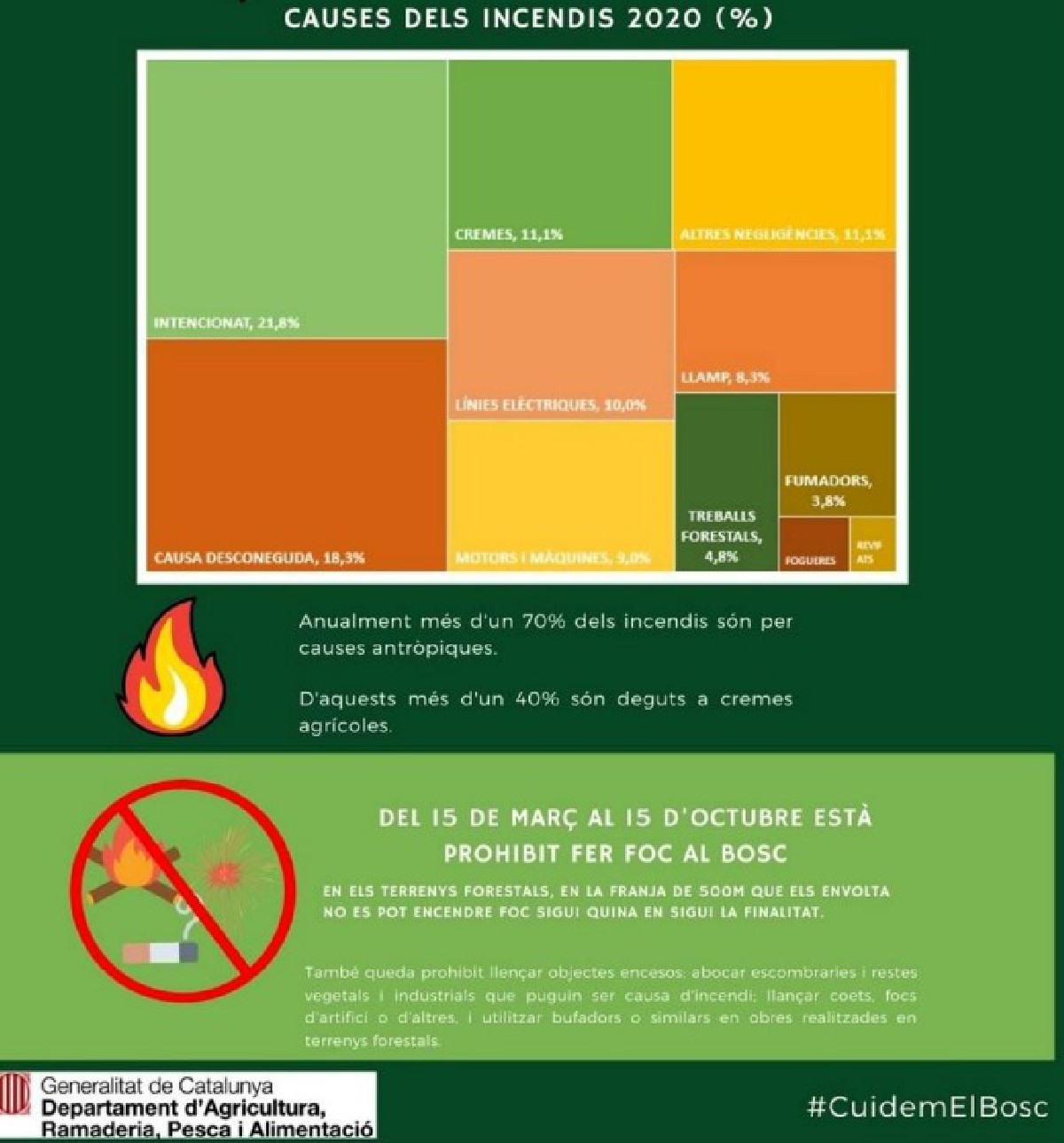 A partir d'avui comença la prohibició de fer foc al bosc. Del 15 de març al 15 d'octubre, no es pot fer foc als terrenys forestals sense autorització. L'any 2020 va ser un dels millors anys de la història en baix nombre d'incendis forestals