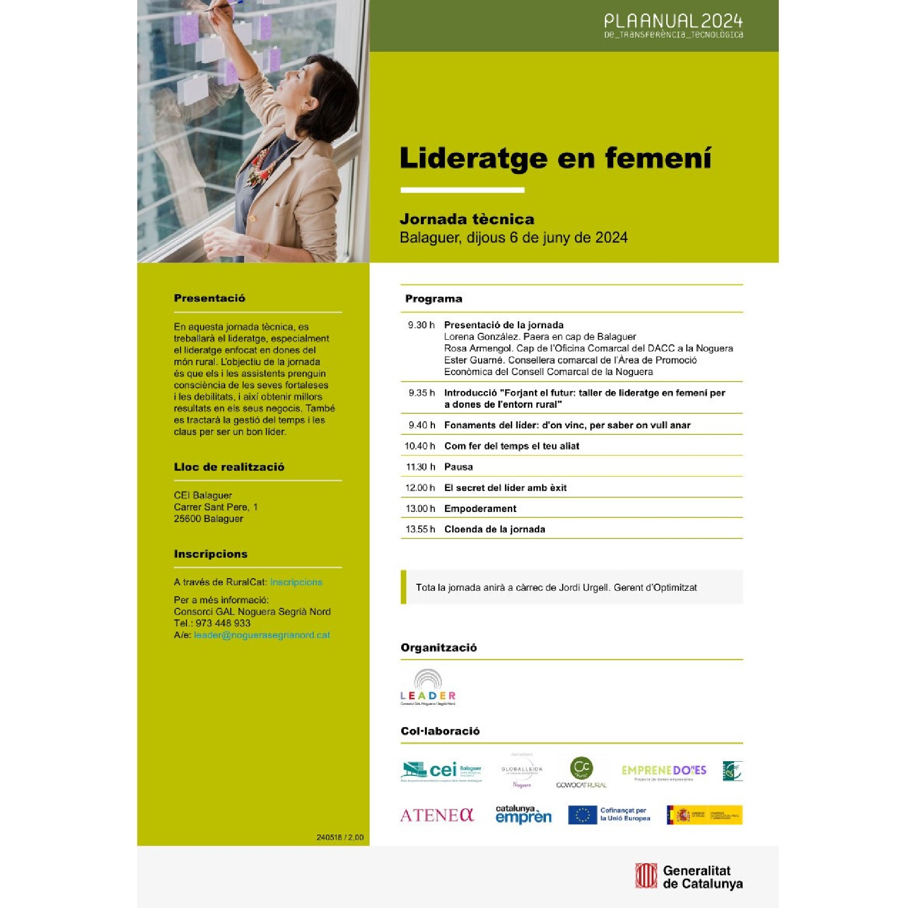El Consorci Grup d'Acció Local Noguera-Segrià Nord dinamitza una jornada al CEI Balaguer de 'Lideratge en femení', el proper 6 de juny. La jornada tècnica forma part d'una iniciativa per donar suport i visualitzar les sales de coworking del territori