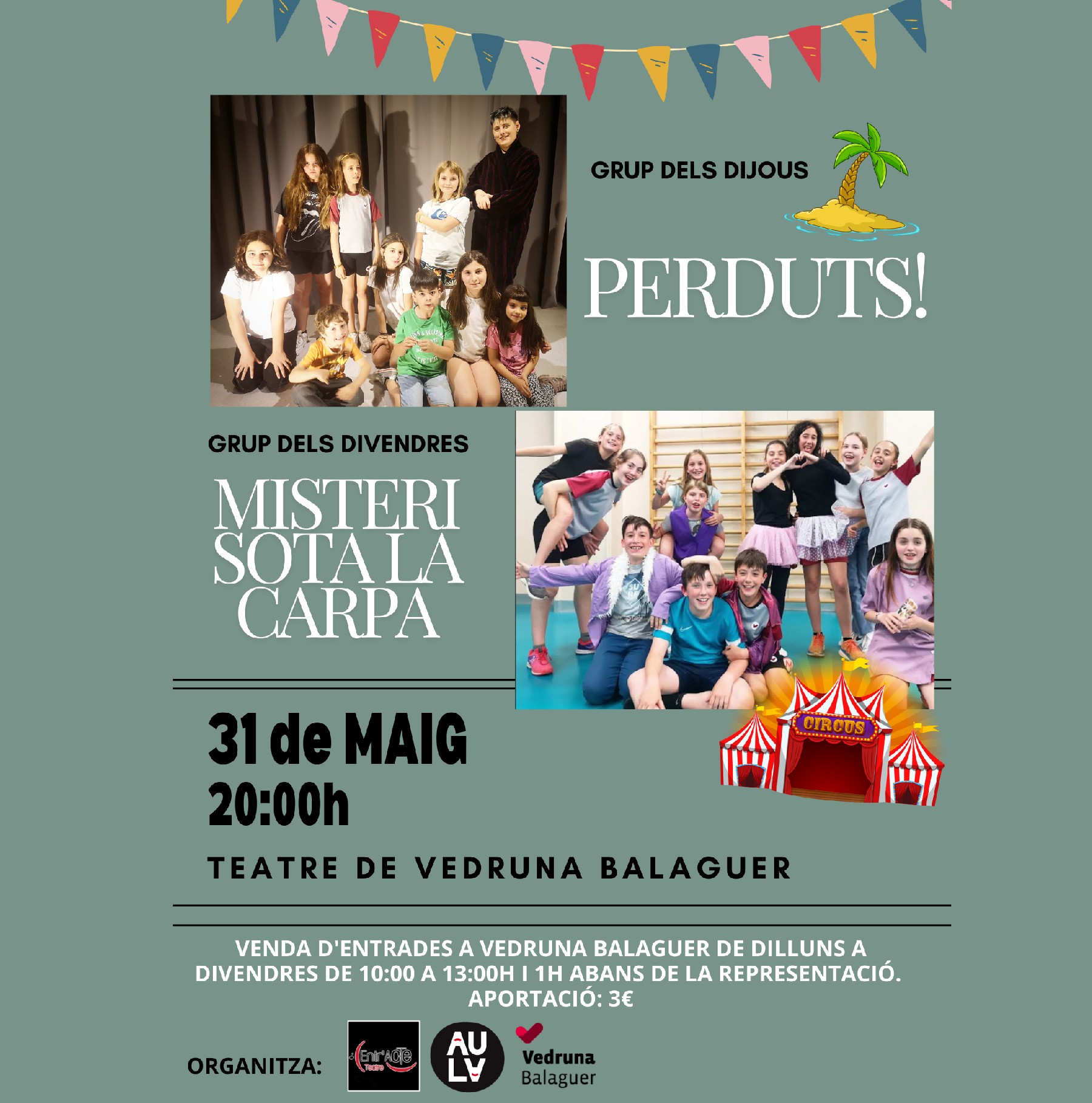 Els Joves de la companyia Entr'Acte Teatre presenten 'Perduts! i Misteri sota la carpa'. Es podran veure el divendres 31 de maig a les 20h al Teatre Vedruna Balaguer