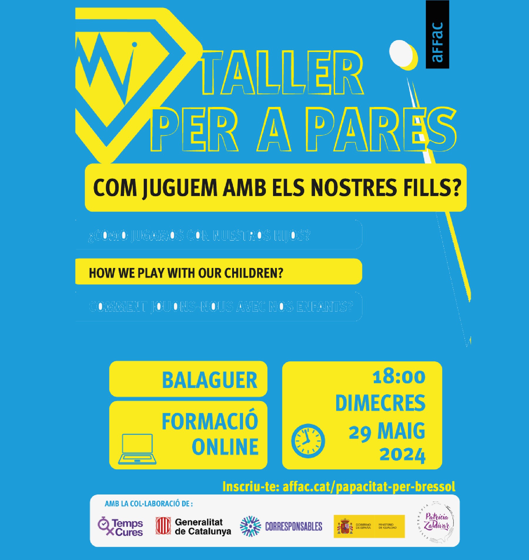 L'AFFaC , Associacions Federades de Famílies d'Alumnes de Catalunya, organitza el pròxim dimecres dia 29 de maig en format online el taller 'Com juguem amb els nostres fills?'