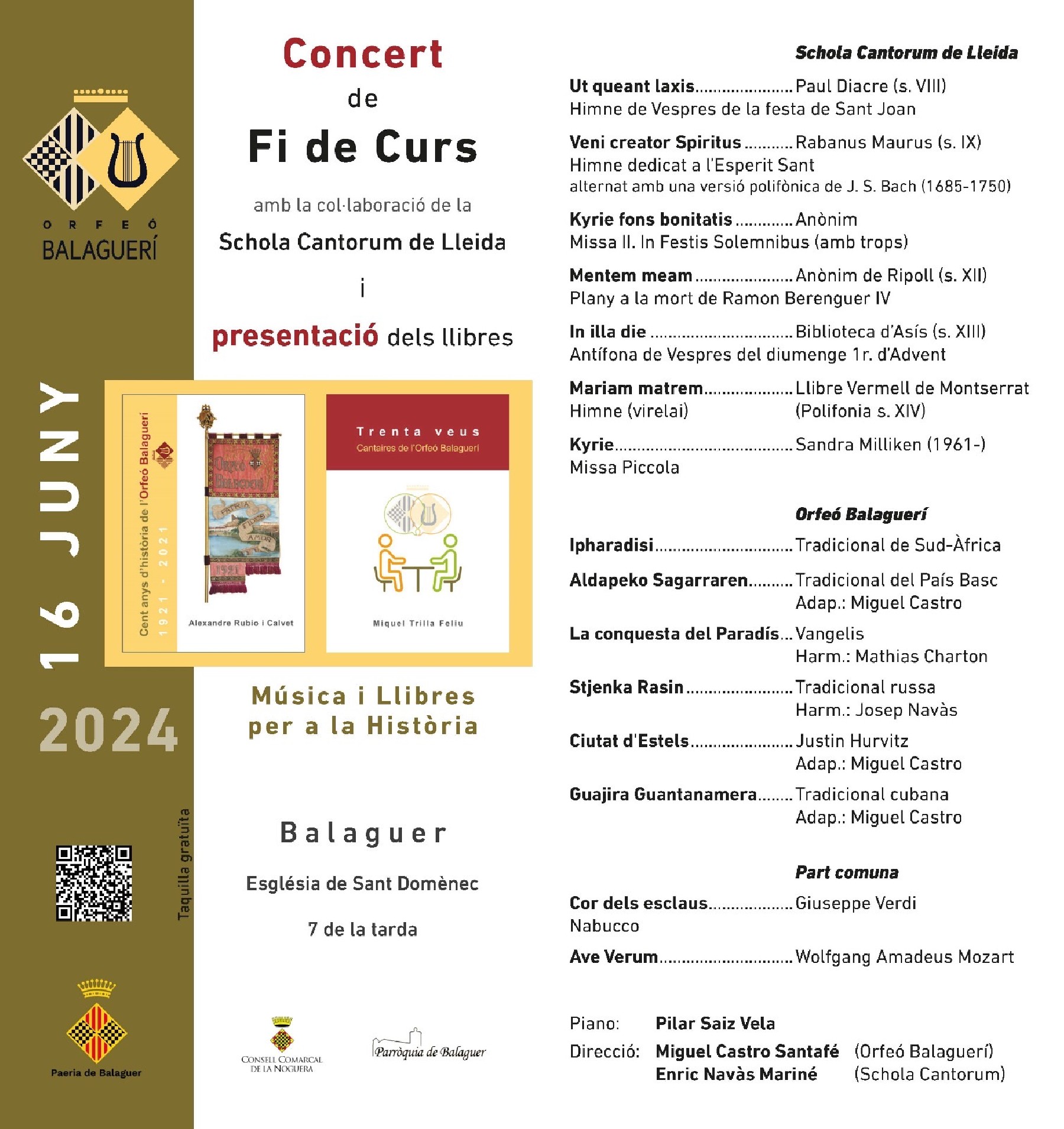 El proper diumenge dia 16 de juny, a l'església de sant Domènec i a partir de les 19h, l'Orfeó Balaguerí oferirà el tradicional Concert Fi de curs.