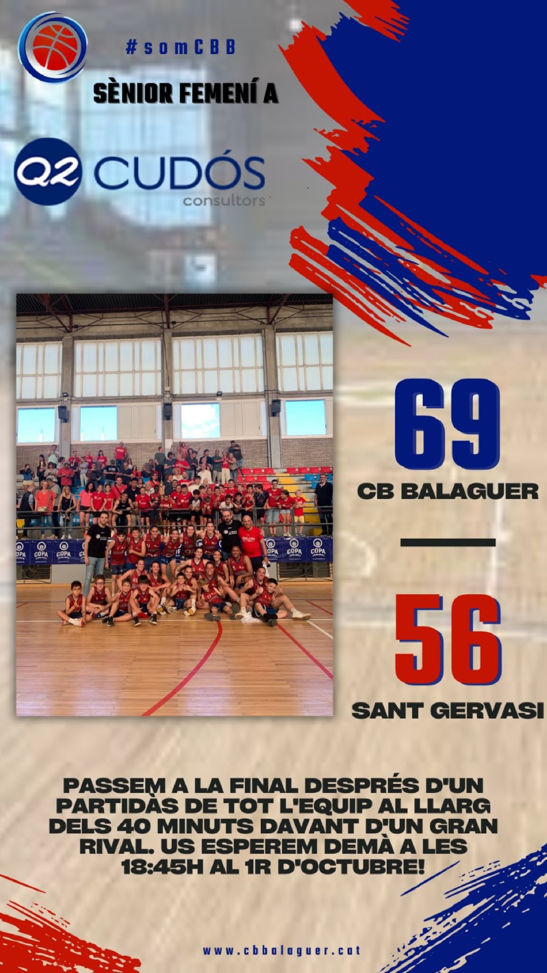 El Q2 Consultors del Club Bàsquet Balaguer guanya per 69 a 56 al Sant Gervasi a la semifinal i demà diumenge jugarà la final amb l'Espanyol. El partit es jugarà a les 18.45h al 1r d'Octubre