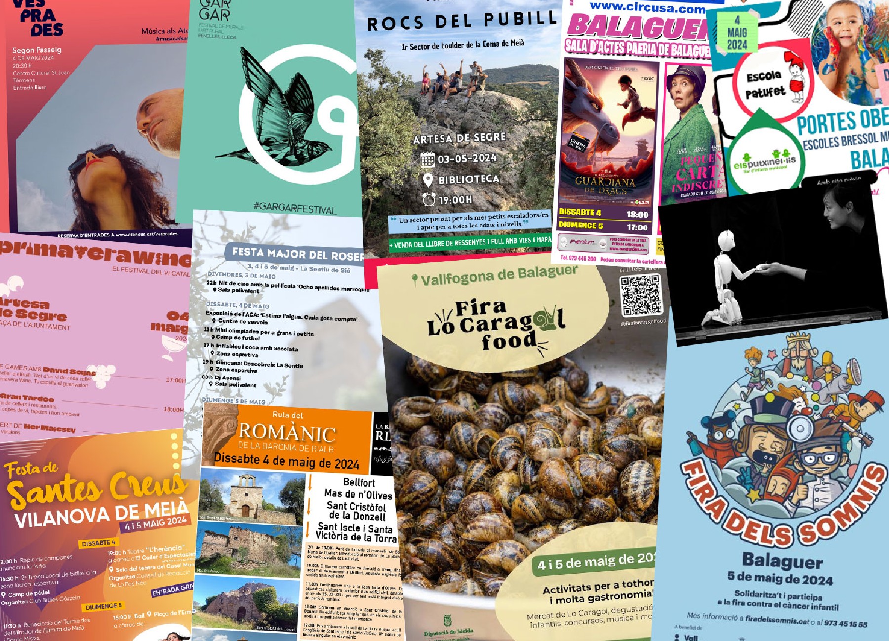 Cap de setmana amb la Fira dels Somnis contra el càncer infantil a Balaguer. També amb espectacles de titelles a La Mercantil. A comarca és la Fira del Caragol a Vallfogona i el Gargar a Penelles, i festa major a Vilanova i La Sentiu