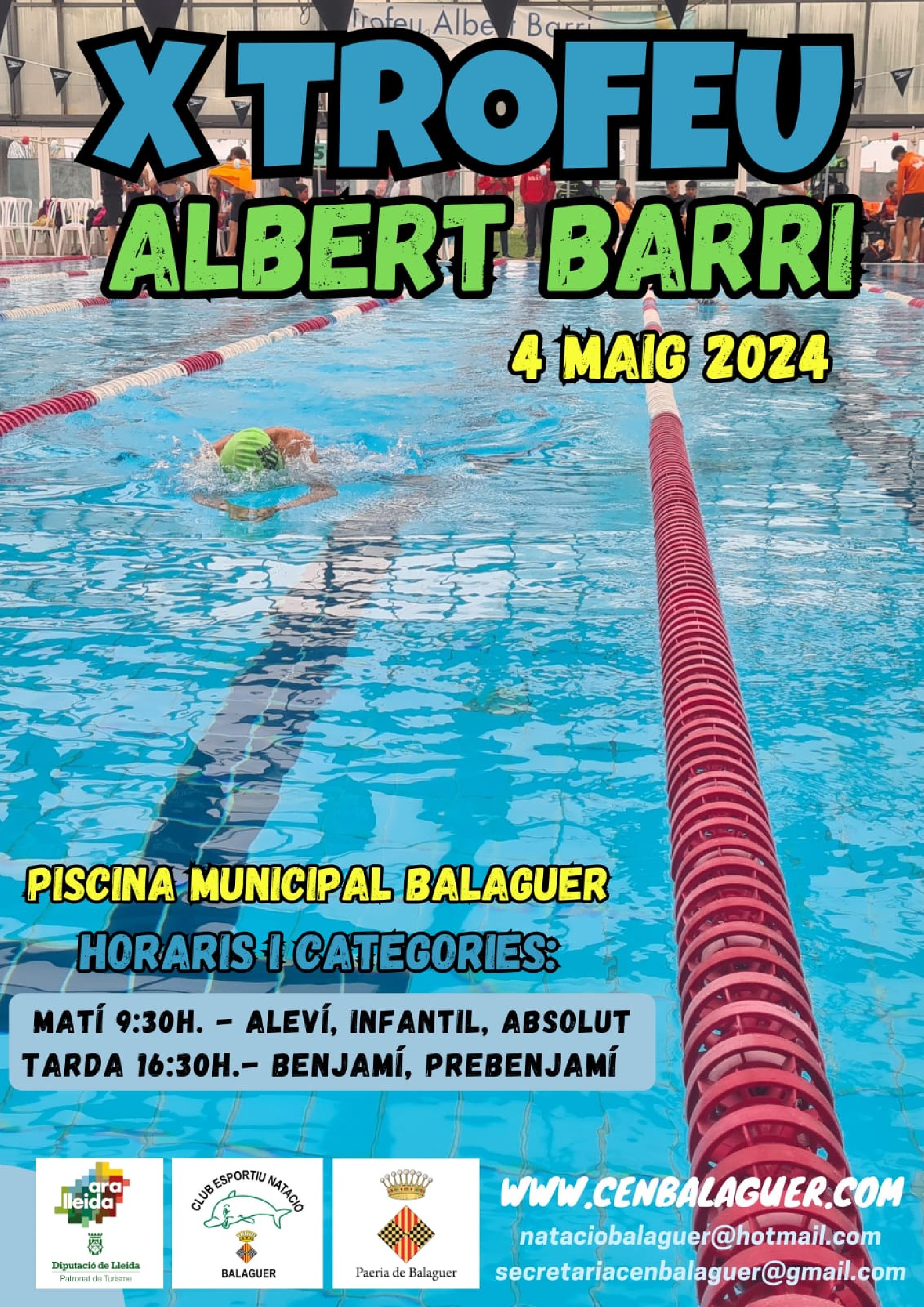 Aquest dissabte dia 4 de Maig es disputarà un any més, i ja van 10 anys, el Trofeu Albert Barri de natació a la piscina municipal de Balaguer