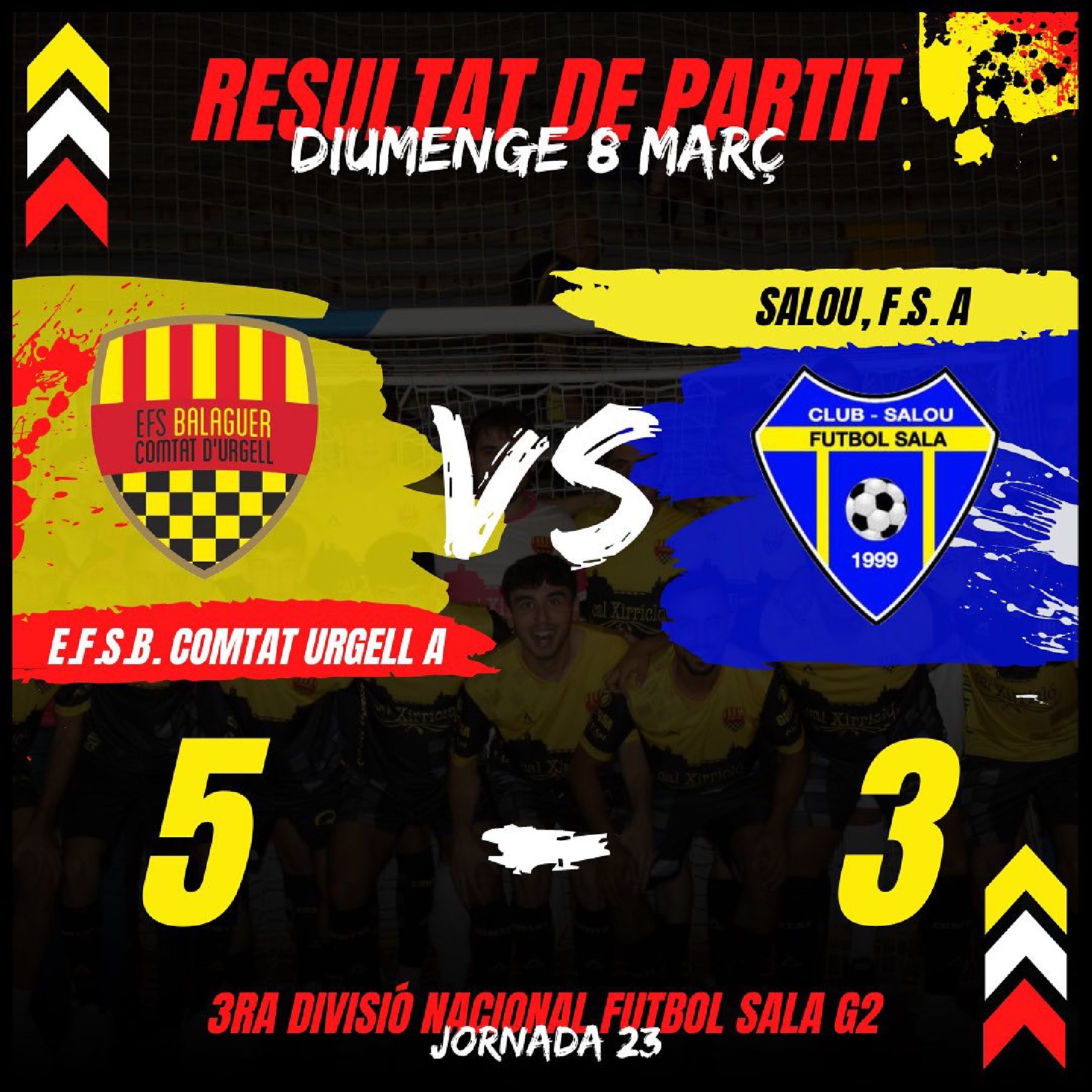 El Comtat d'Urgell de futbol sala s'imposa per 5 a 3 al Salou, 3r classificat de la categoria. També va guanyar el Comtat B, per un contundent 9 a 3 al Corbins, i el Balaguer Vedruna perdia 1 a 0 a la pista del Pardinyes