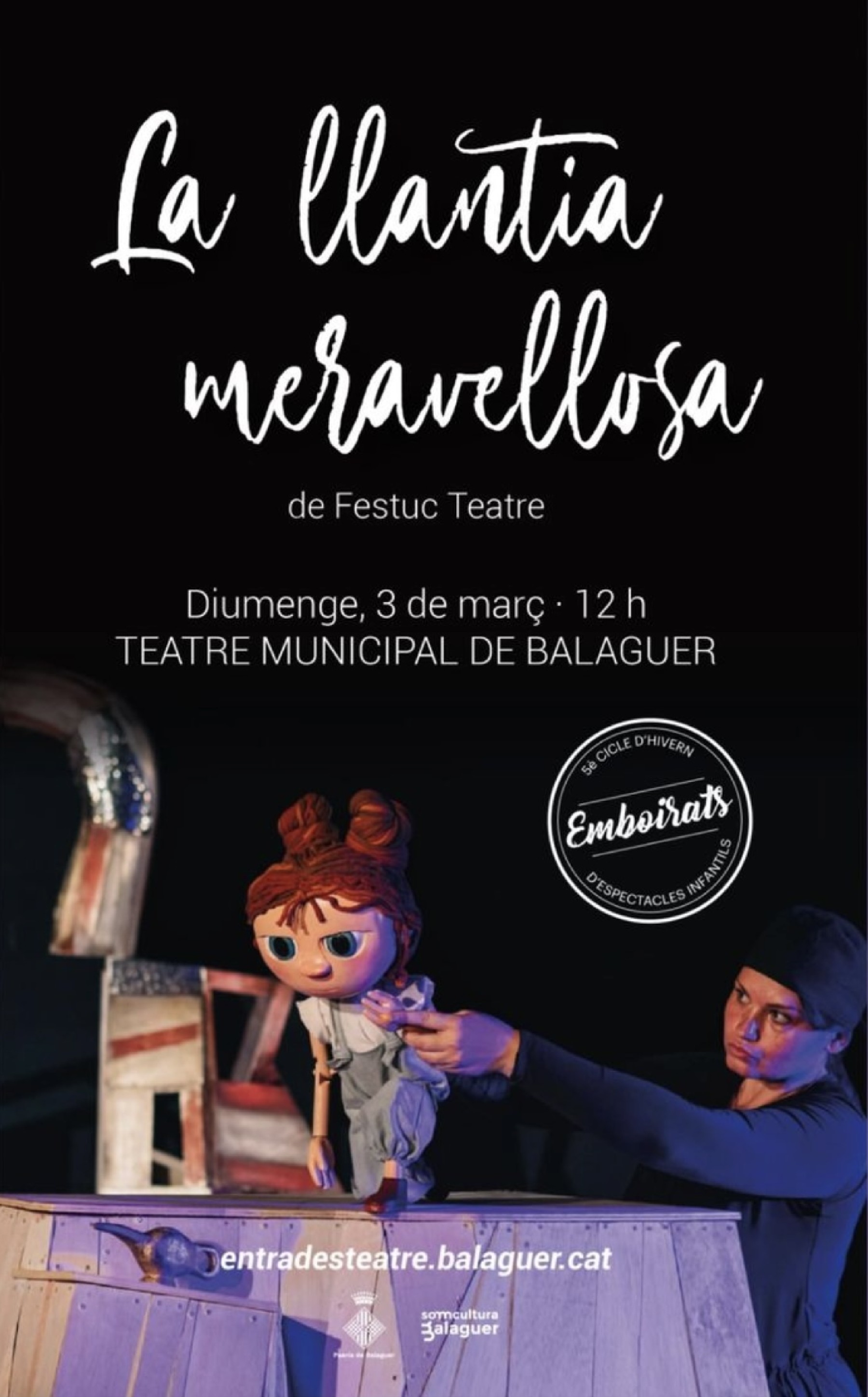 El Teatre Municipal de Balaguer ha estat escenari aquest diumenge de la darrera obra del cicle d'hivern d'espectacles infantils Emboirats'' amb l'espectacle La llàntia meravellosa' de Festuc Teatre