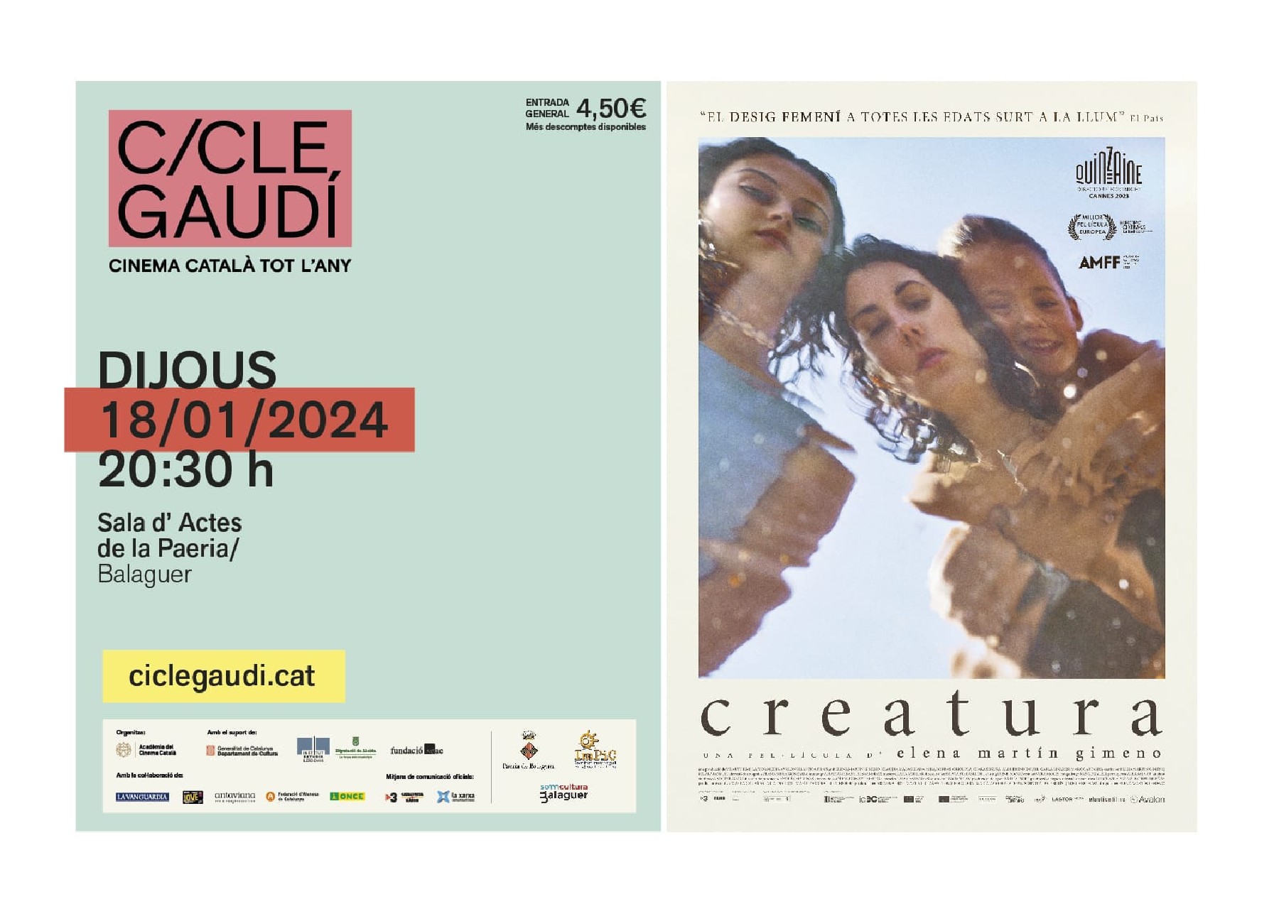 Continua a Balaguer el Cicle Gaudí de cinema, amb la projecció aquest dijous de la pel·lícula Creatura, nominada a 15 premis Gaudí