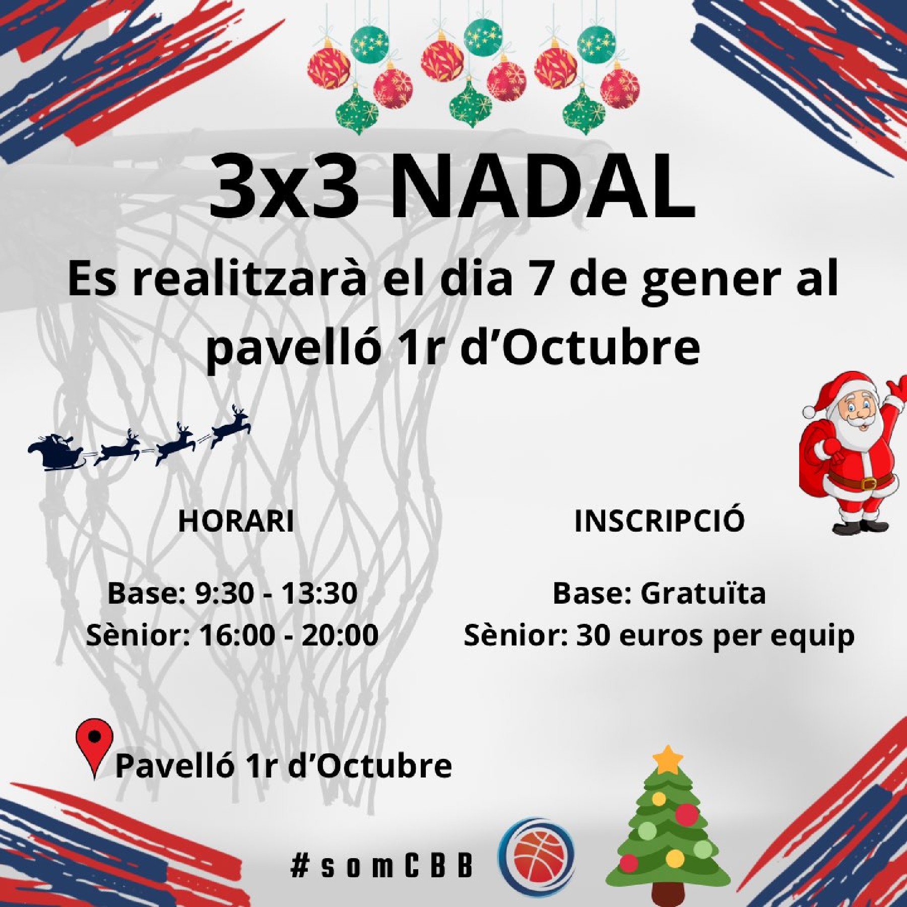 El Club Bàsquet Balaguer obre les inscripcions per al 3x3 de Nadal, que es jugarà al 1r d'Octubre el diumenge 7 de gener. Compta amb dues modalitats, per a jugadors de base i per a jugadors sèniors