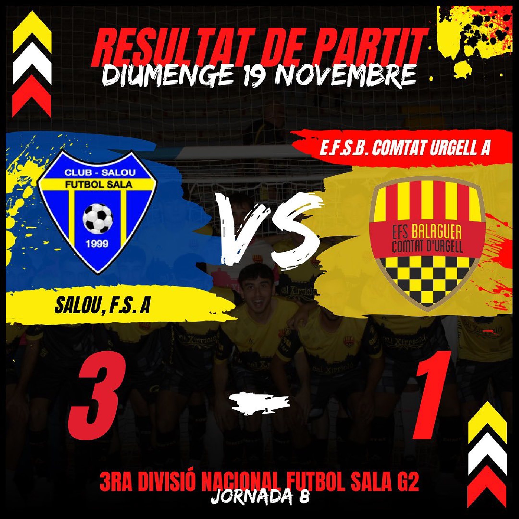 El Comtat d'Urgell de futbol sala perd 3 a 1 a Salou. El Comtat B guanya 3 a 6 a la pista del Corbins