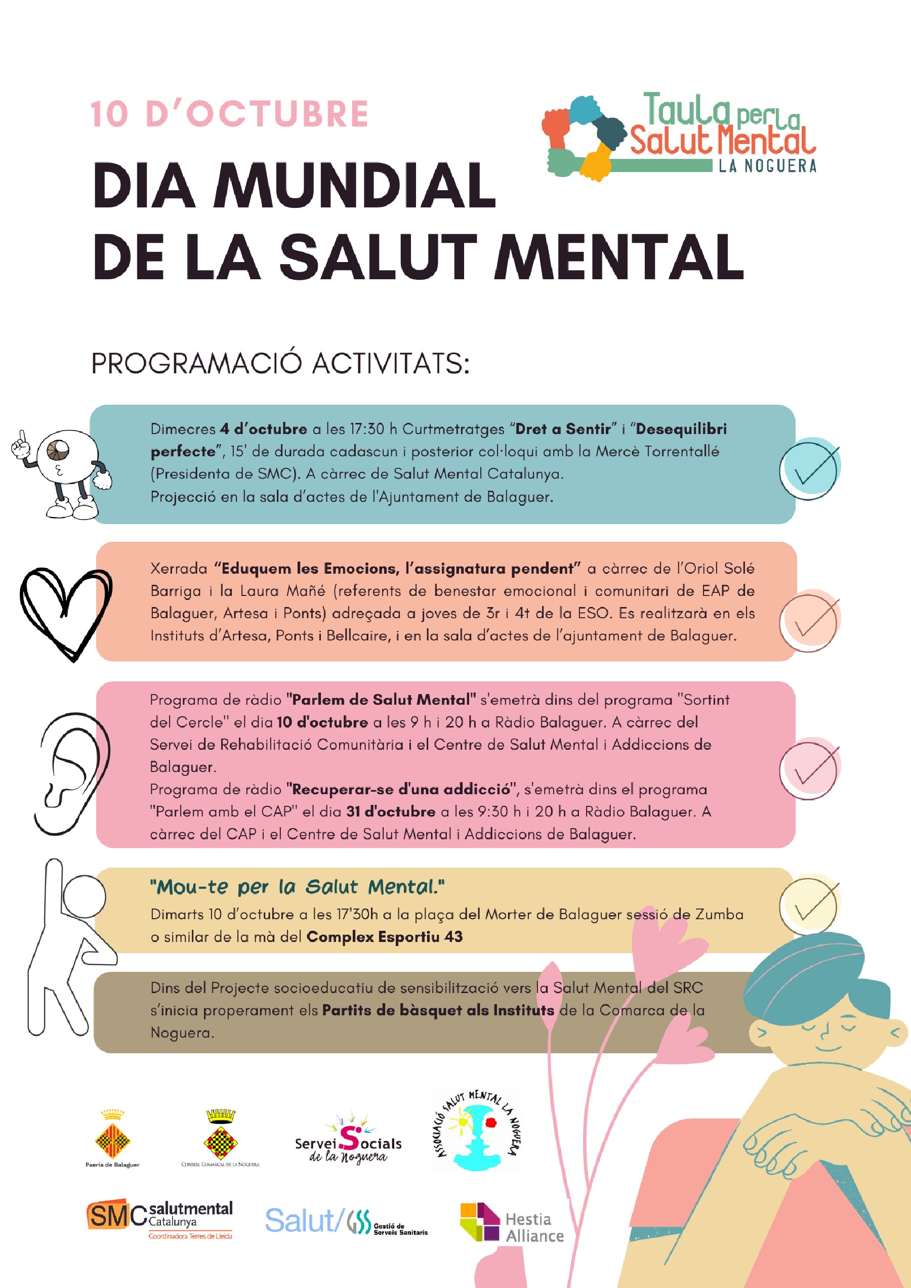 Aquest dimecres s'inicien els actes de celebració del Dia Mundial de la Salut Mental amb una projecció de curtmetratges i un col·loqui posterior a la sala d'actes de la Casa de la Paeria de Balaguer