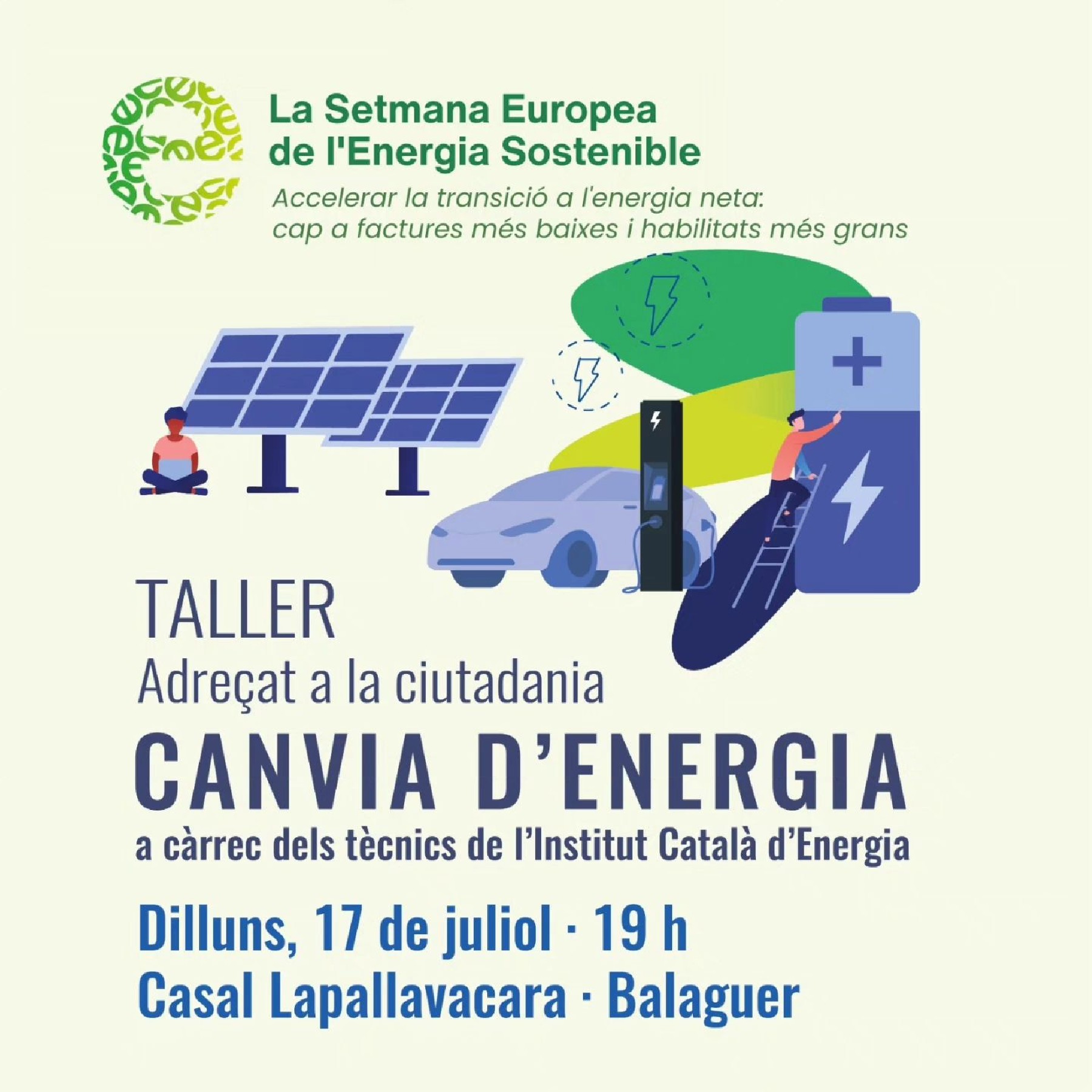 El CEI Balaguer acull aquest dilluns el taller 'Canvia d'energia'. Es tracta d'una activitat adreçada a la ciutadania en què es parlarà sobre contractació elèctrica, eficiència energètica, energia solar fotovoltaica i mobilitat elèctrica