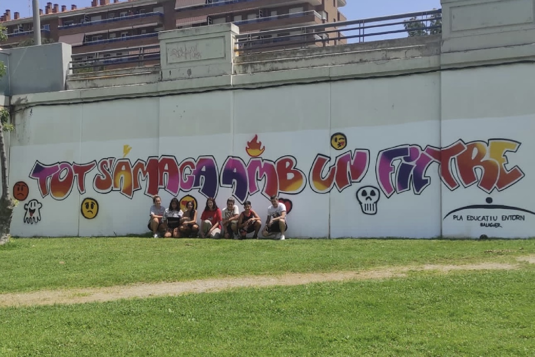 Els participants al taller de grafit que s'està fent a Balaguer, en el marc de les Setmanes OMG organitzades pel Pla Educatiu d'Entorn, han finalitzat aquest divendres el grafit que han pintat en una de les parets del marge esquerra del riu Segre