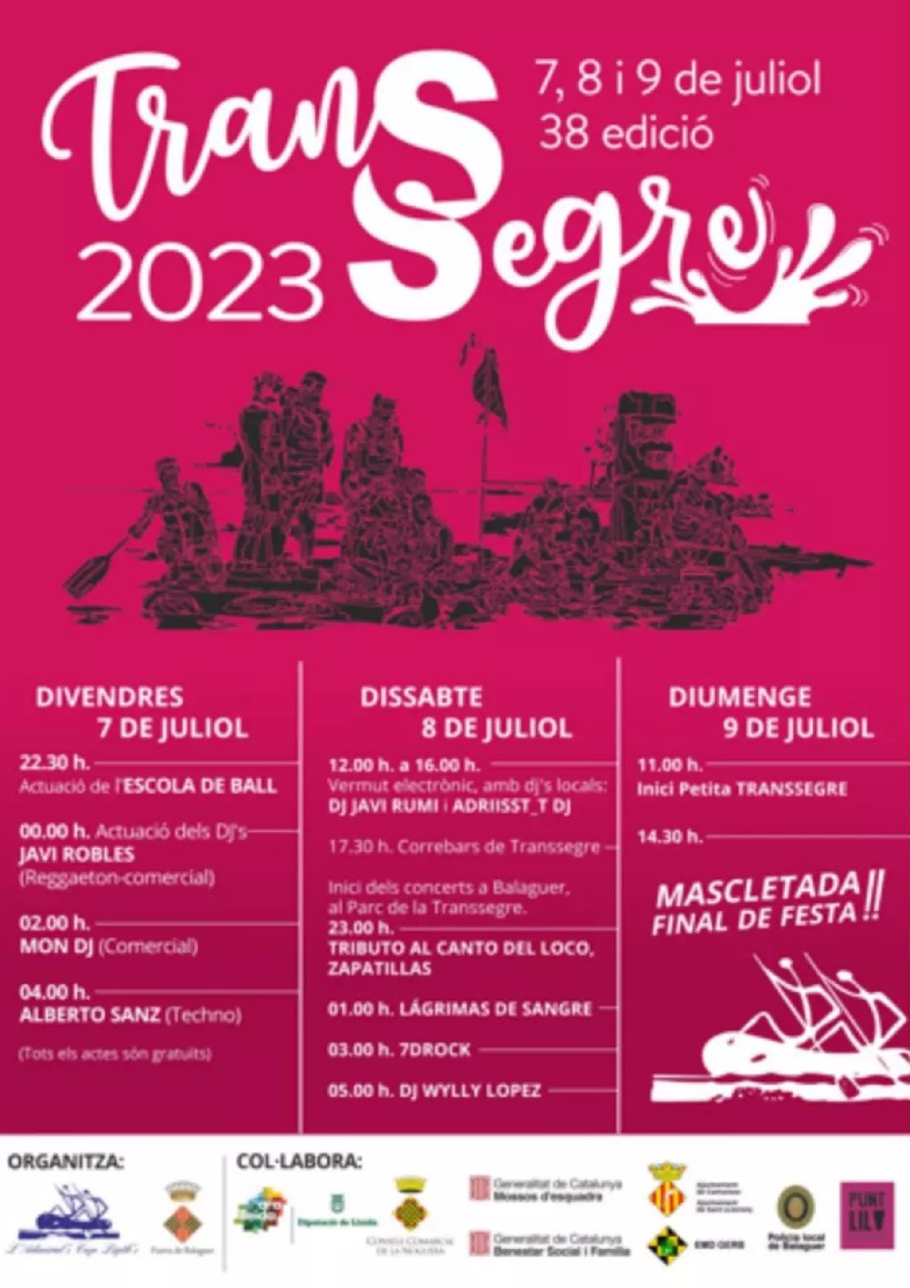 La Transsegre de Balaguer se celebrarà els dies 7,8 i 9 de juliol, enguany sense baixada de barques a causa de la sequera. Només es faran els concerts al parc de la Transsegre amb els grups Lágrimas de Sangre, 7dRock i djs, entre altres