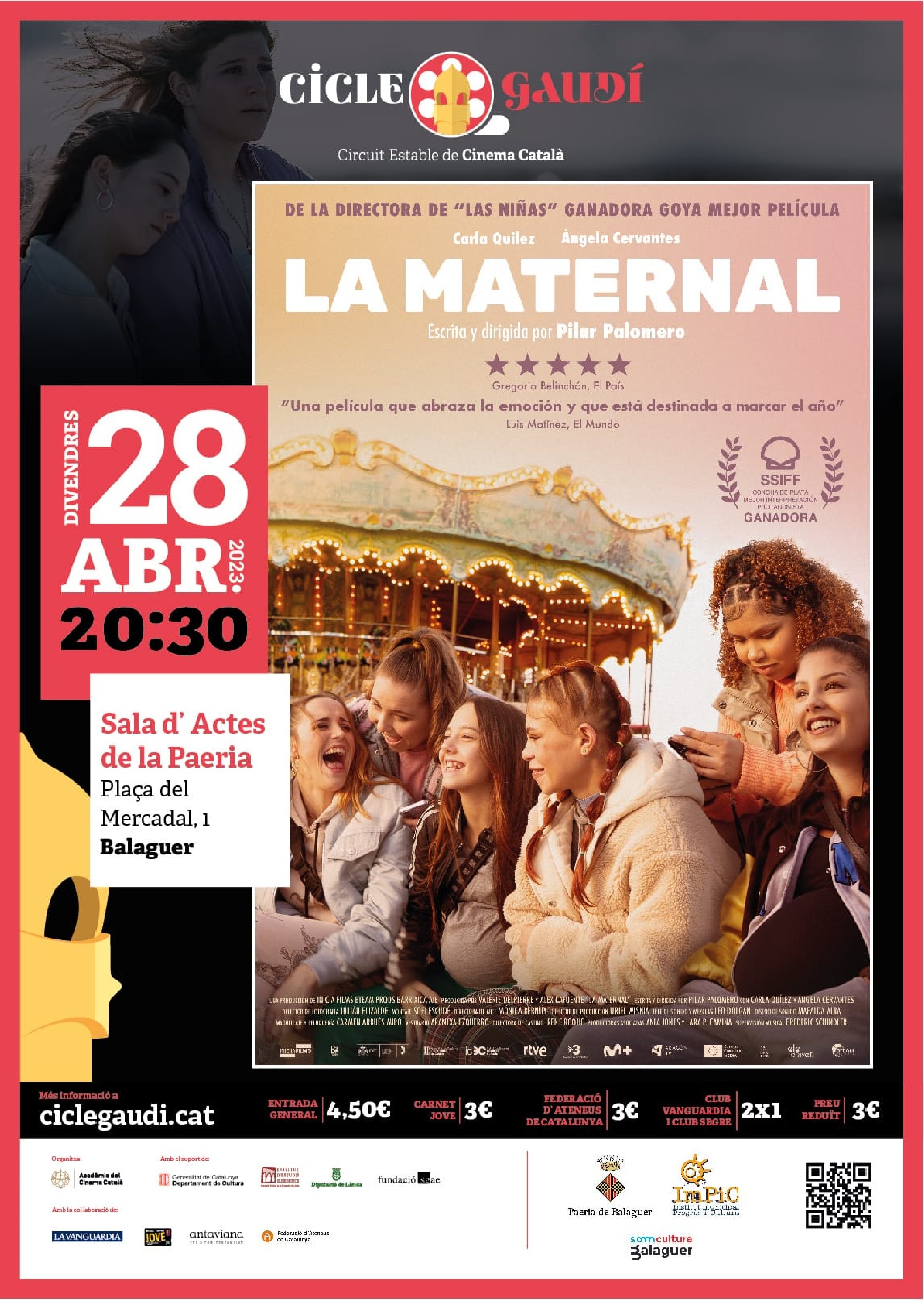 El divendres 28 d'abril continua el Cicle Gaudí de Cinema amb la projecció de la pel·lícula La maternal, dirigida per Pilar Palomero i interpretada per Ángela Cervantes, Carla Quílez
