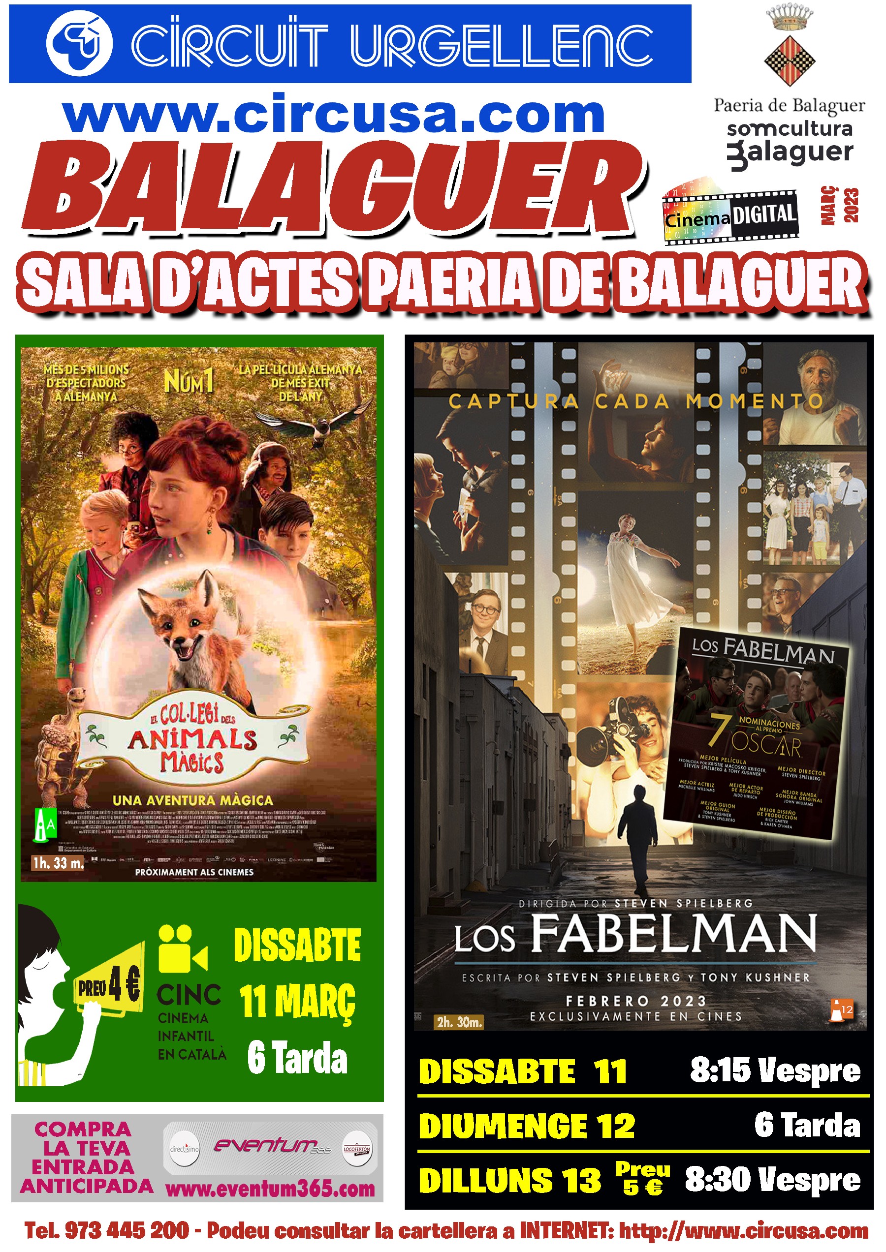 Al cinema Balaguer es podrà veure aquest cap de setmana la pel·lícula LOS FABELMAN, la darrera pel·lícula dirigida per Steven Spielberg. I dins del CINC 'El col·legi dels animals màgics'