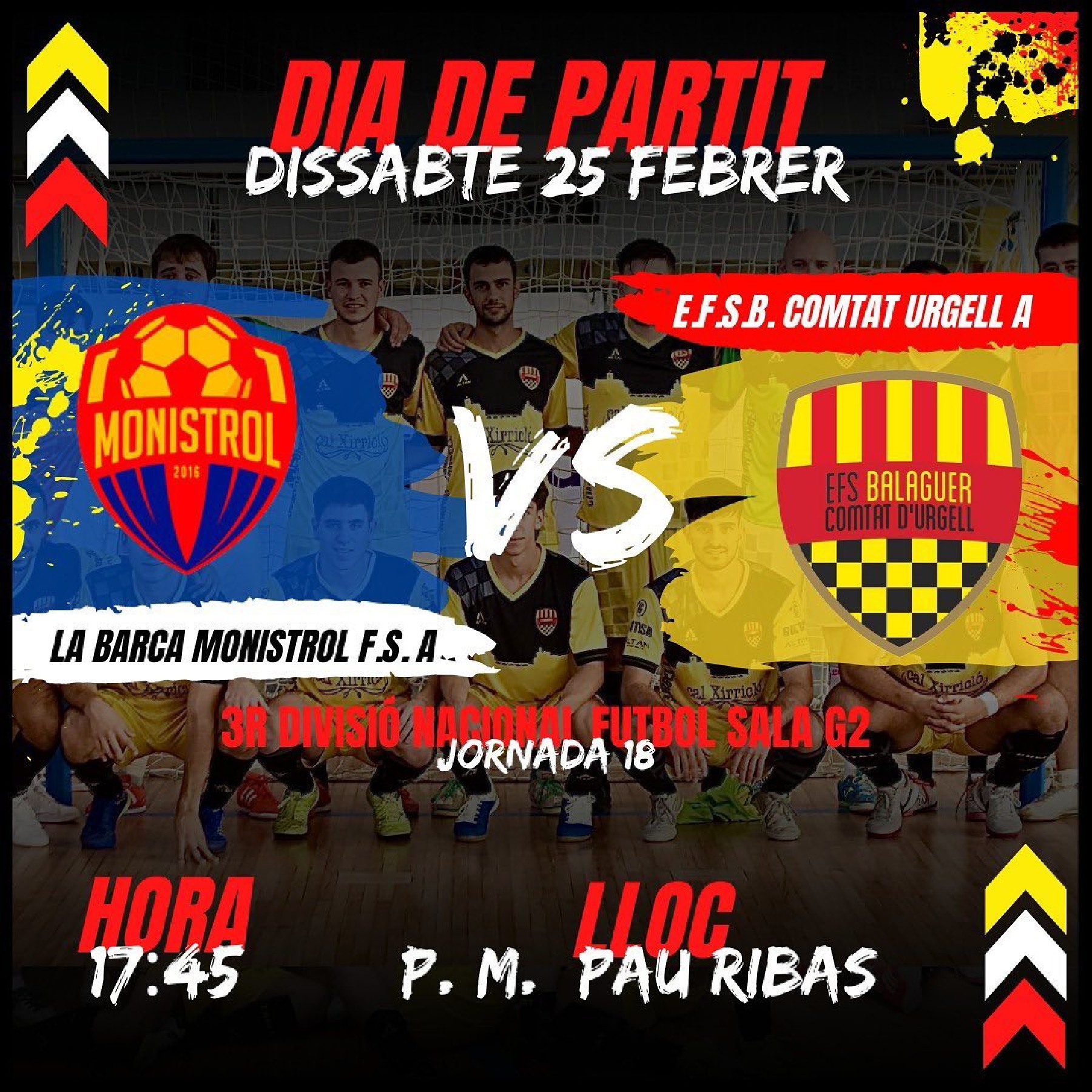 El primer equip del Comtat d'Urgell de Futbol Sala afronta dissabte una visita complicada a la pista del Monistrol. A Primera Catalana el Comtat B rep al Bellaguarda i el Balaguer Vedruna visita al Vila-sana