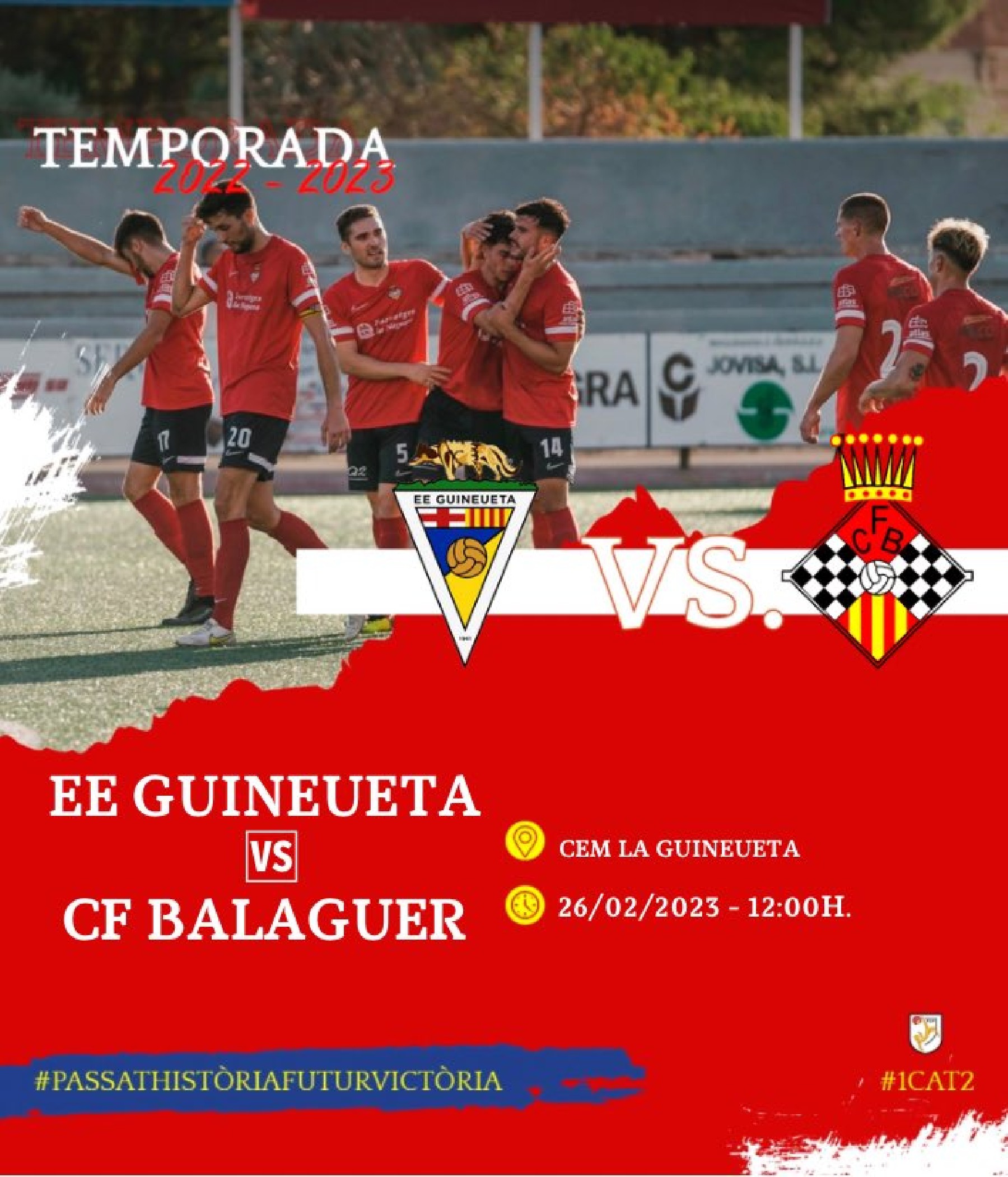 El primer equip del Club Futbol Balaguer visita aquest diumenge al migdia a la Guineueta, un partit difícil contra el quart classificat. El Juvenil A visita al Sant Cugat i el Juvenil B disputa un derbi comarcal en rebre a l'Artesa de Segre
