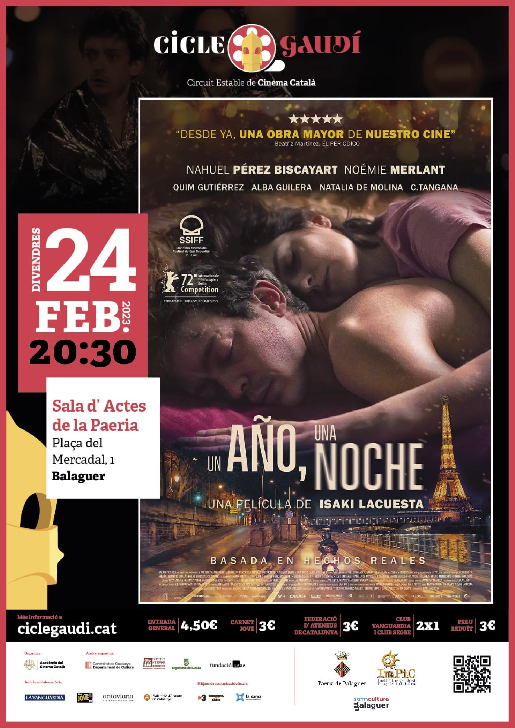 El divendres 24 de febrer arriba al cinema Balaguer, dins del Cicle Gaudí de cinema català, la projecció de la pel·lícula Un año y una noche, dirigida per Isaki Lacuesta