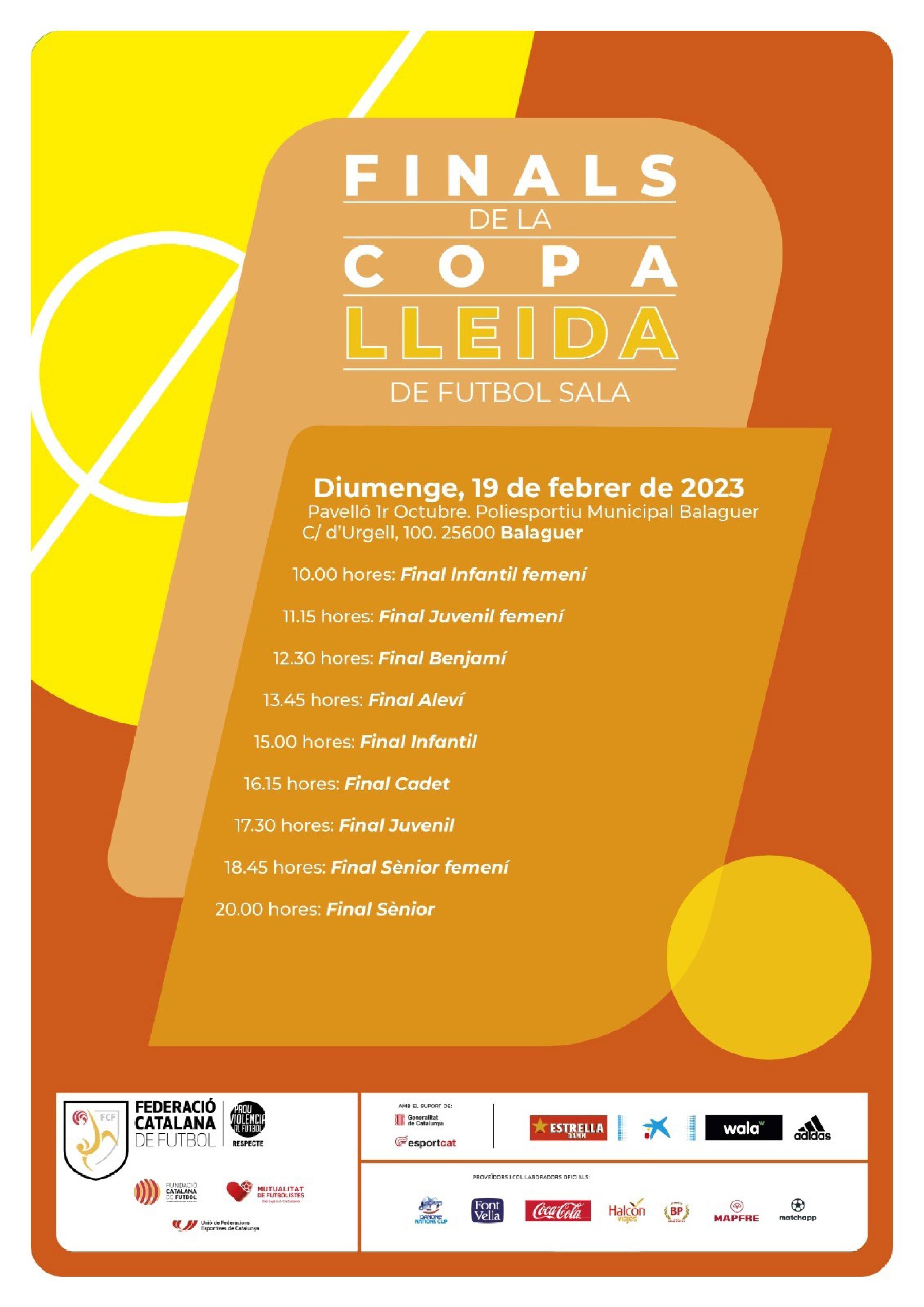 Aquest diumenge es disputen al pavelló poliesportiu Inpacsa de Balaguer les finals de la Copa Lleida de Futbol Sala. Hi jugaran categories des de benjamí a sèniors tant masculines com femenines en partits que es jugaran durant tot el dia