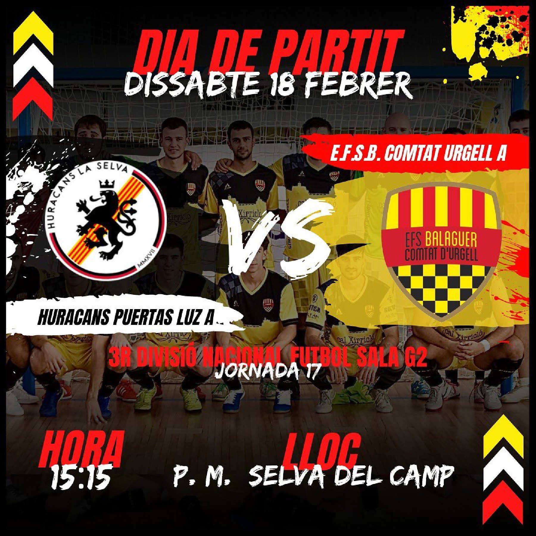 El primer equip del Comtat d'Urgell de futbol sala visita aquest dissabte a ¼ de 4 de la tarda la pista dels Huracans de la Selva del Camp, l'últim classificat