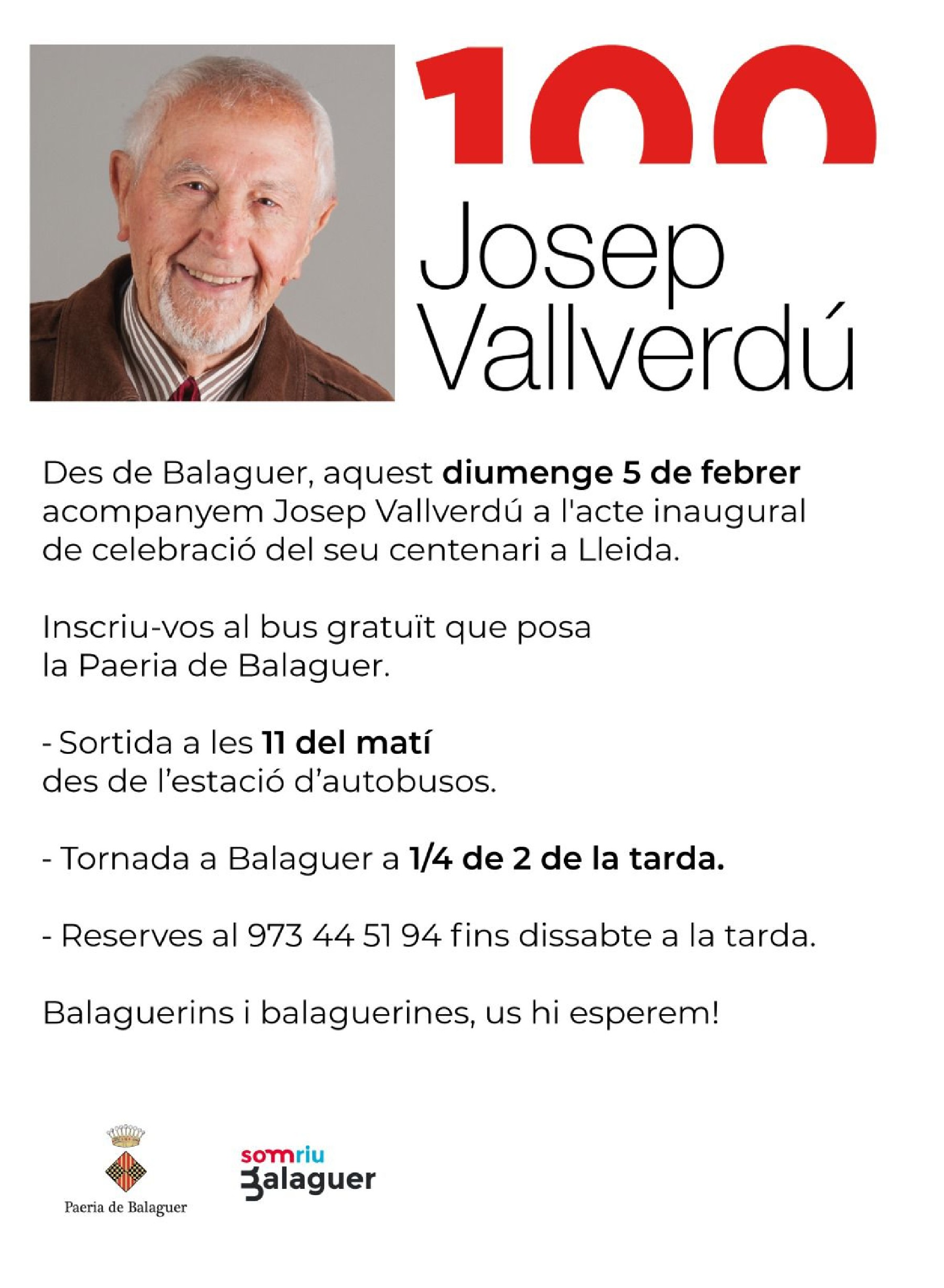 La Paeria de Balaguer organitza un bus gratuït a Lleida amb motiu de l'acte inaugural de celebració del centenari de Josep Vallverdú, que es realitzarà aquest diumenge al matí a Lleida