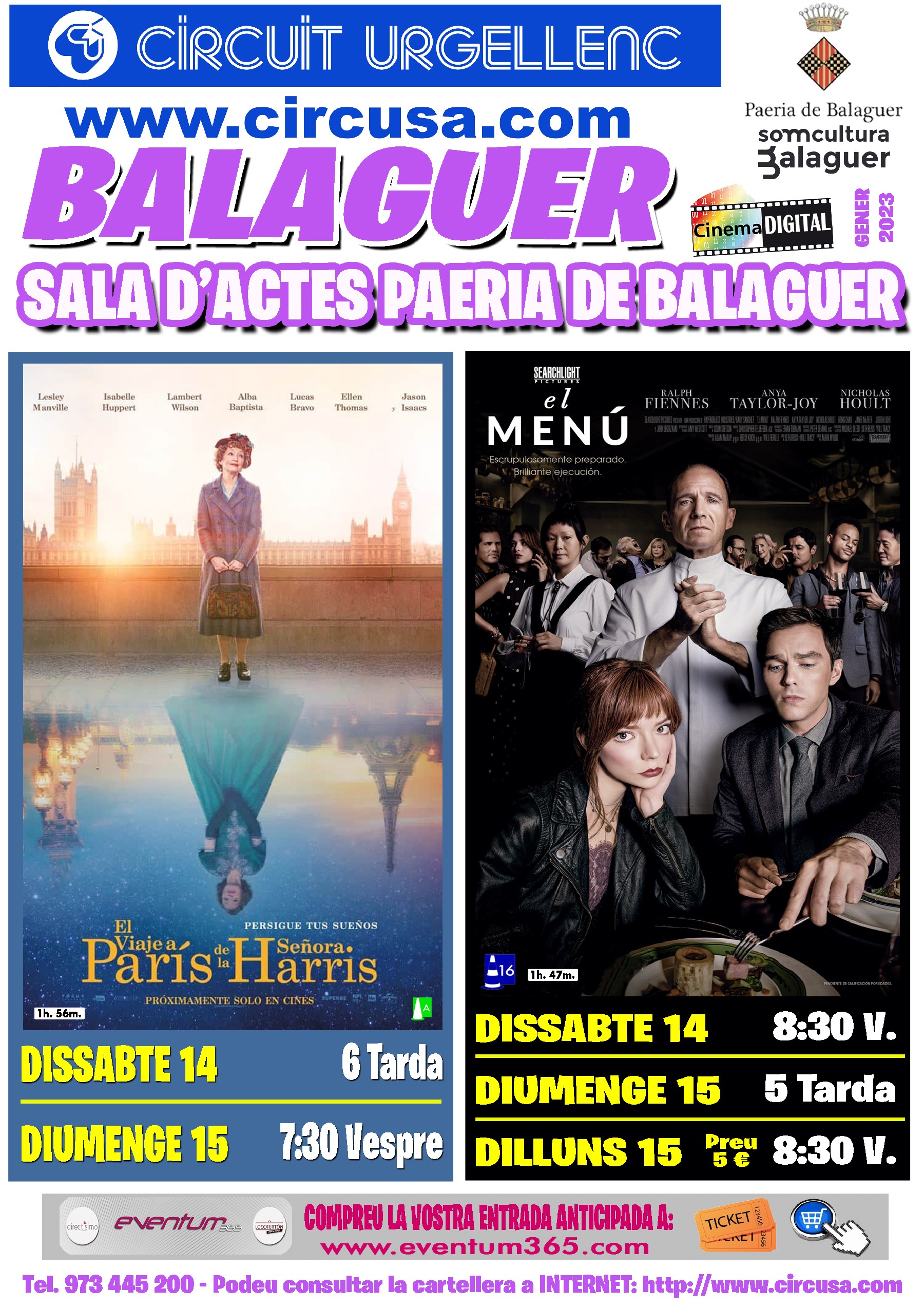 Al cinema Balaguer es podran veure les pel·lícules EL VIAJE A PARÍS DE LA SEÑORA HARRIS i també el film EL MENÚ