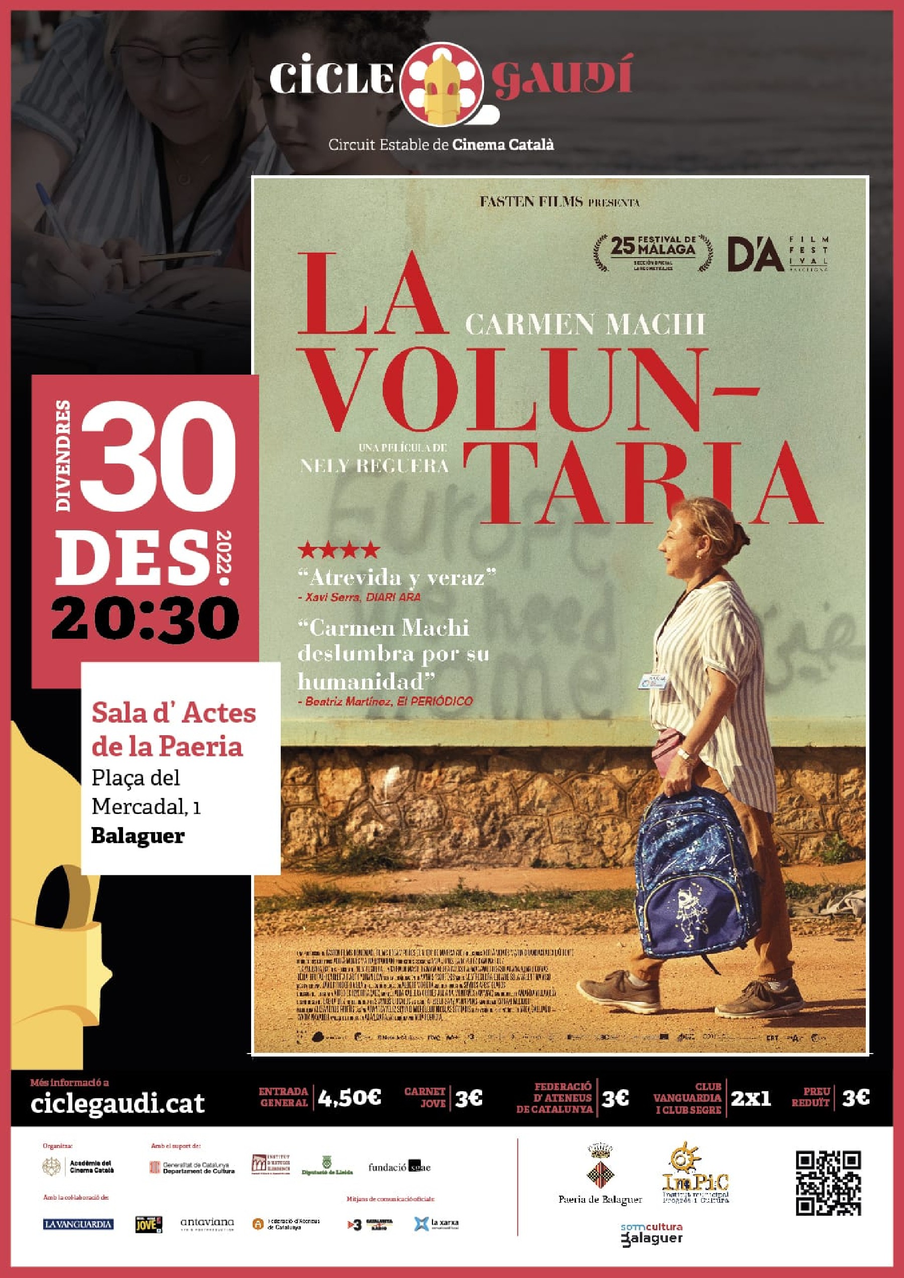 Arriba a Balaguer, dins del Cicle Gaudí de cinema català, la projecció de la pel·lícula LA VOLUNTARIA, dirigida per Nely Reguera