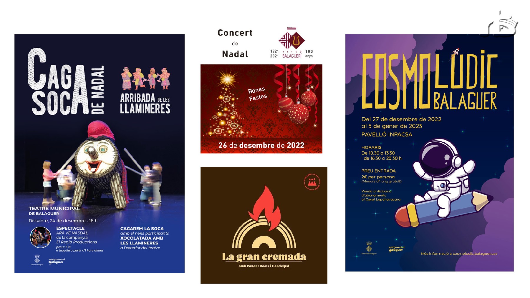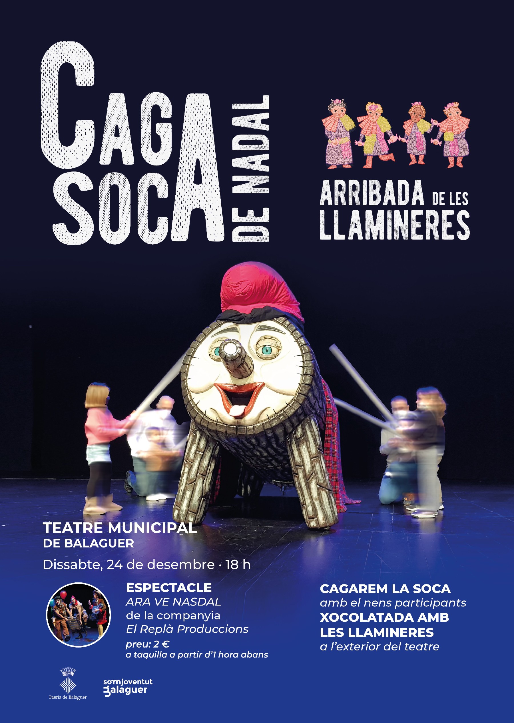 Balaguer celebra aquest dissabte al Teatre Municipal el tradicional 'caga soca'. Ho farà amb l'espectacle 'ARA VE NASDAL', de Replà Produccions. Tot seguit els nens i nenes podran fer cagar la Soca, amb l'arribada de les Llamineres, i una xocolatada