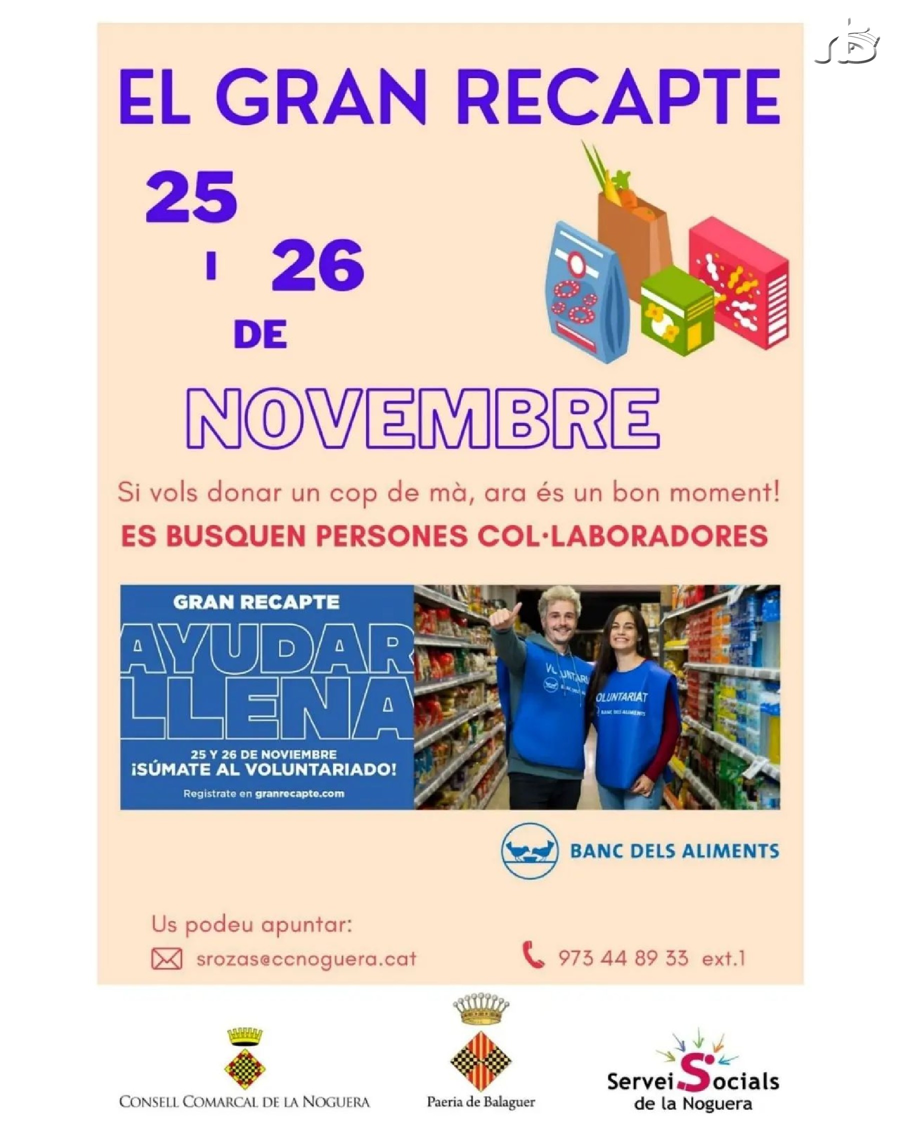 L'àrea de Serveis Socials del Consell Comarcal de la Noguera fa una crida per trobar voluntaris per al Gran Recapte d'Aliments dels dies 25 i 26 de novembre