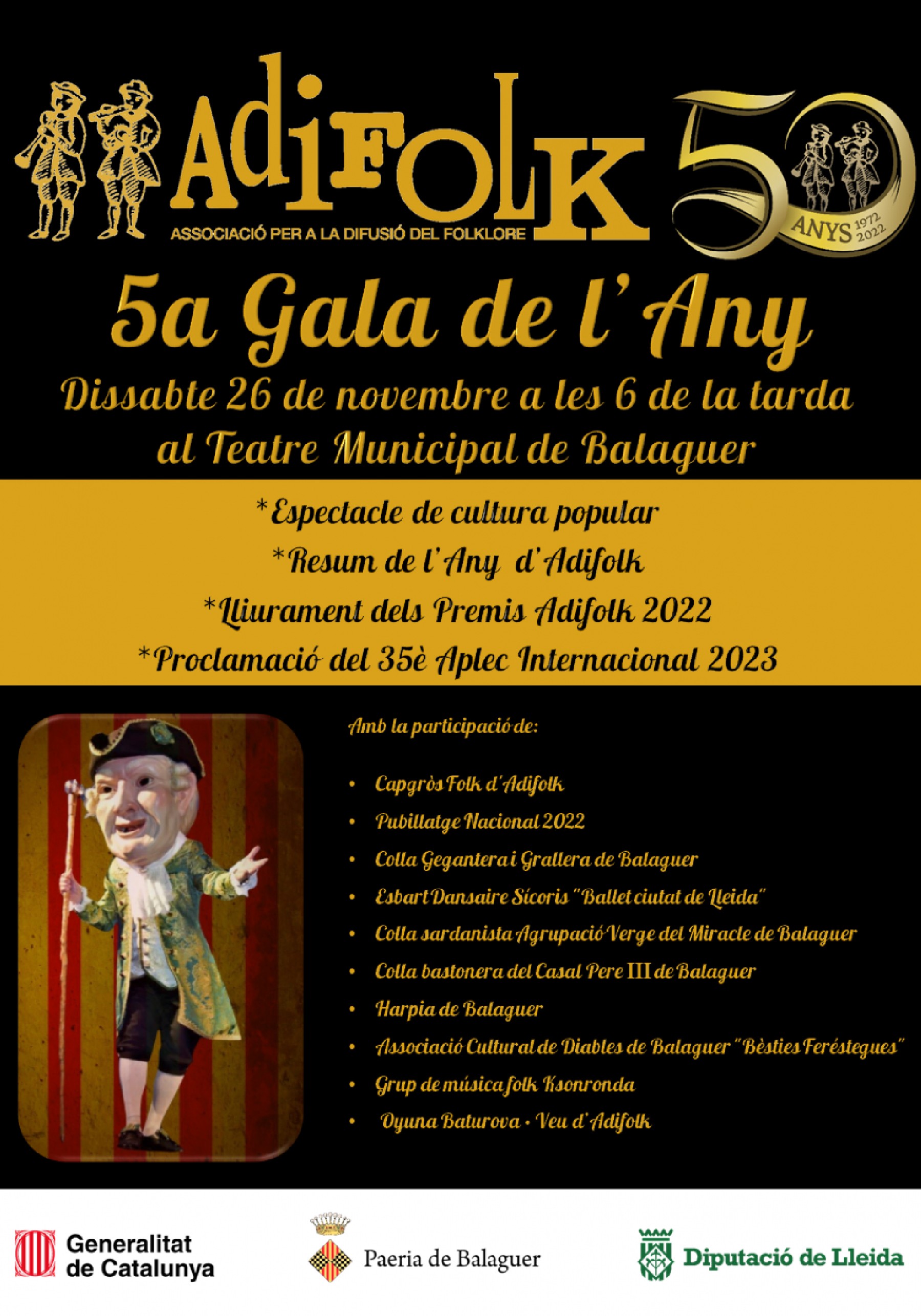 Balaguer serà l'amfitriona de la Gala Adifolk que s'emmarca en la celebració dels cinquanta anys de l'entitat. La gala se celebrarà dissabte dia 26 de novembre a les 18h al Teatre Municipal