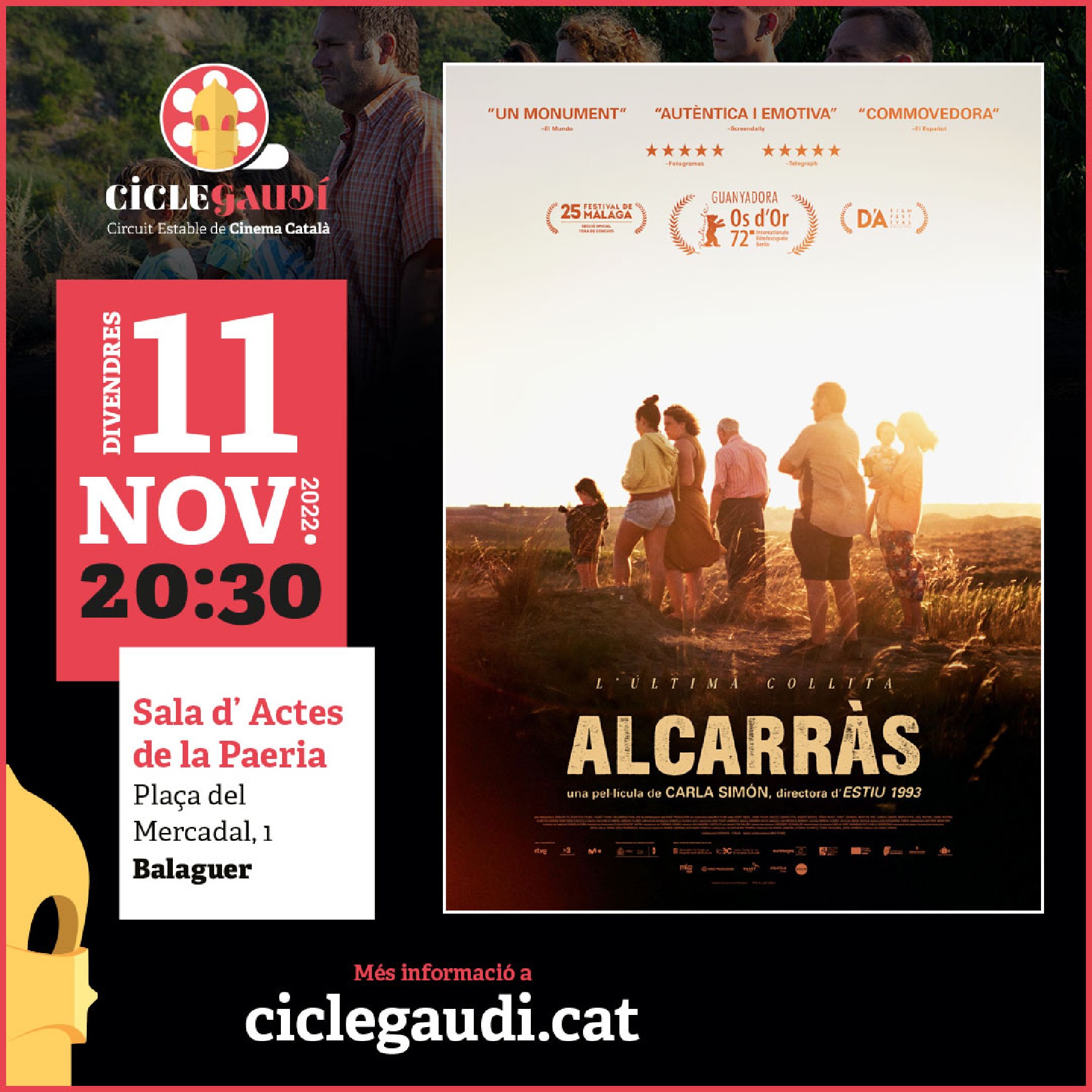 El divendres 11 de novembre arriba a Balaguer dins del Cicle Gaudí de cinema català, la projecció de la pel·lícula ALCARRÀS, de Carla Simón