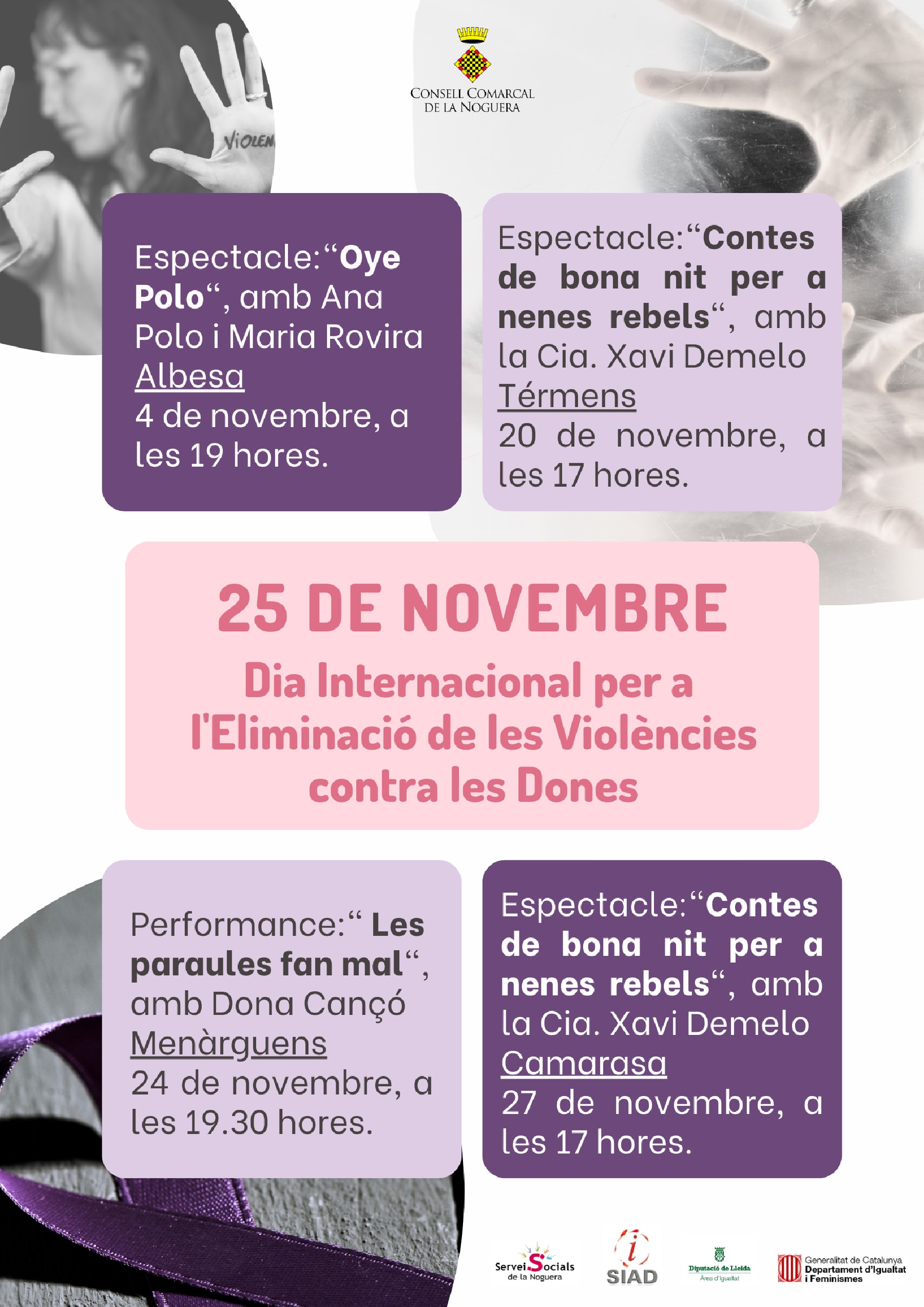 Tornen les activitats amb motiu del 25 de novembre a la Noguera per manifestar el rebuig contra la violència de gènere. Un any més, el Consell Comarcal programa actes en diversos municipis