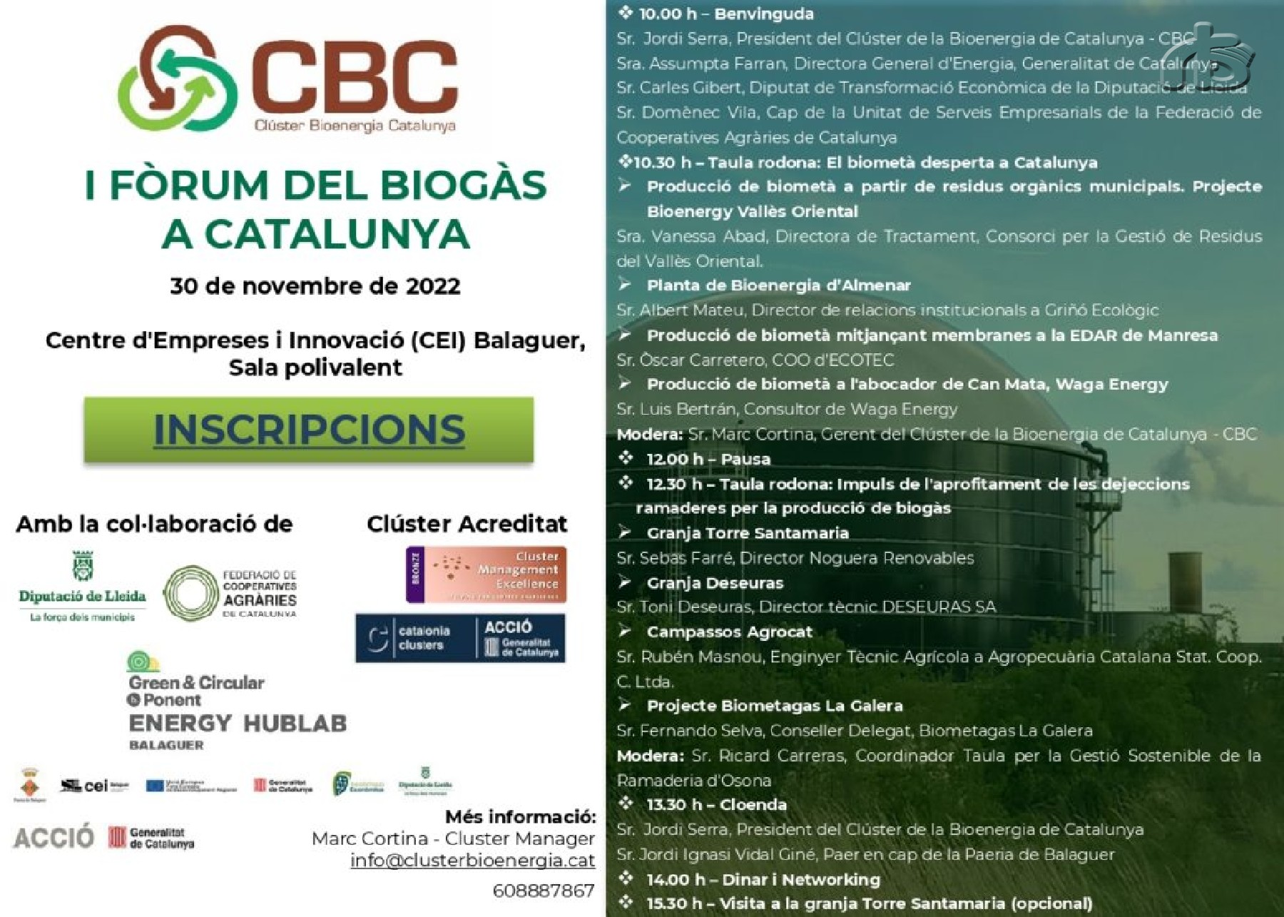 El CEI Balaguer acollirà el I Fòrum del Biogàs a Catalunya el proper 30 de novembre organitzat pel Clúster de Bioenergia de Catalunya, membre del Grup Impulsor de l'Energy HubLab
