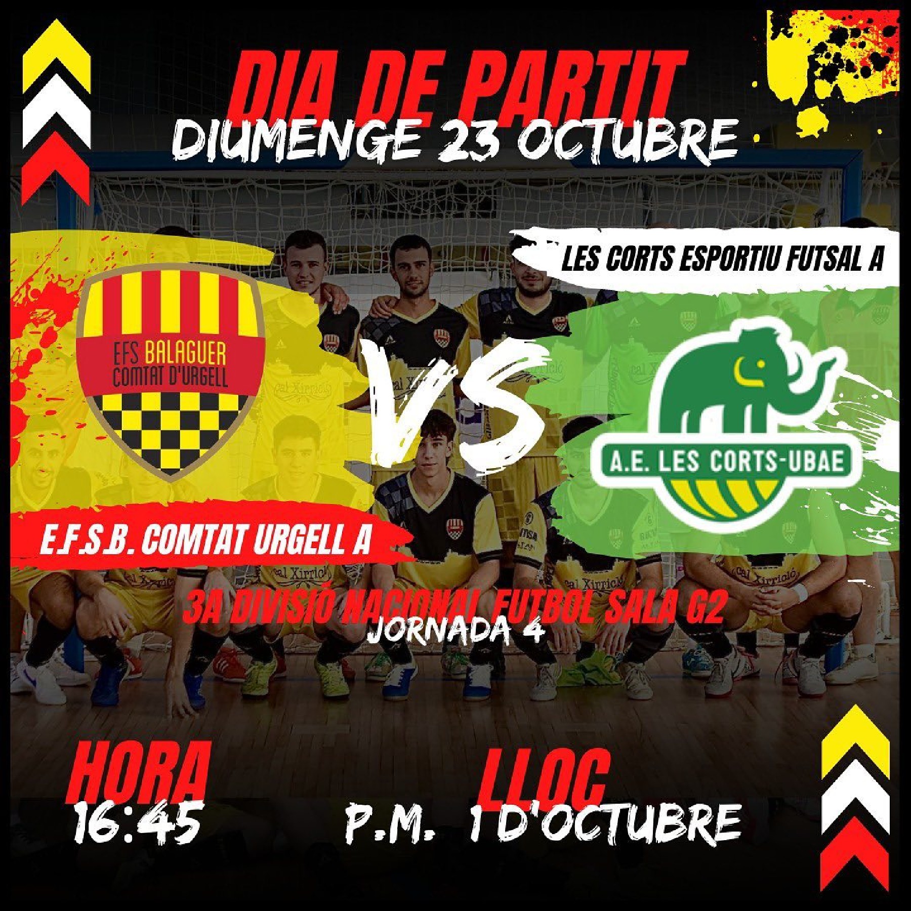 El Comtat d'Urgell de futbol sala rep la visita aquest diumenge de Les Corts Esportiu, l'actual líder de la categoria. Després del partit es farà la presentació de la temporada dels equips base i sèniors