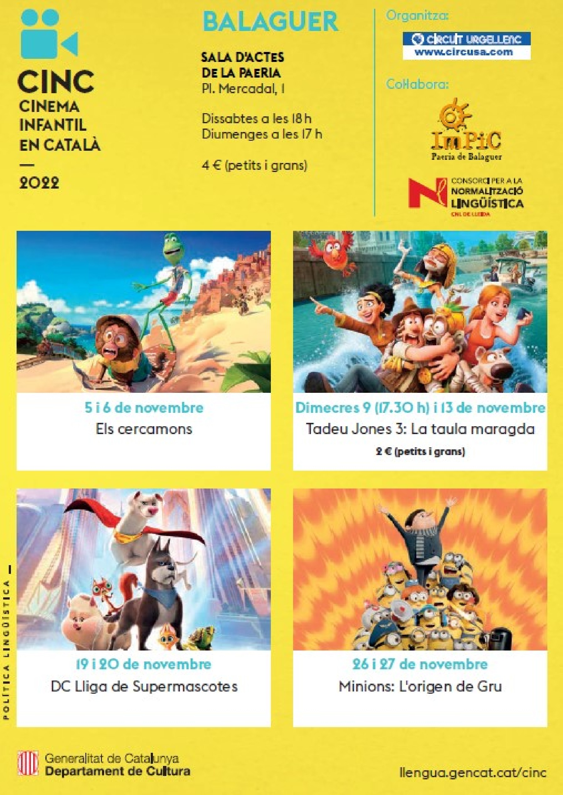 El Departament de Cultura ofereix des d'aquest octubre més de 150 projeccions de cinema infantil en 21 municipis. A Balaguer el cinc arribarà a partir del 5 de novembre
