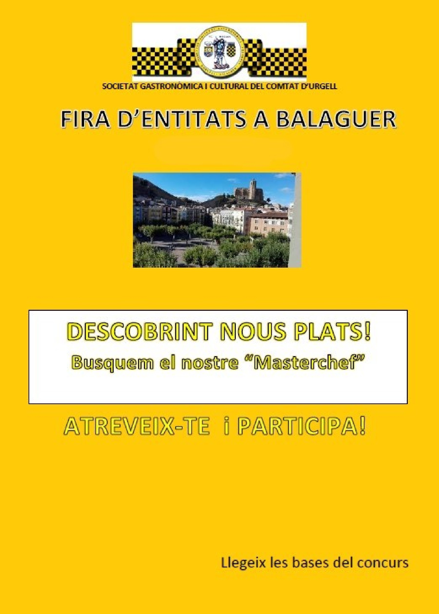 La Societat Gastronòmica i Cultural del Comtat d'Urgell organitza per a la Fira d'Entitats del proper diumenge dia 23 d'octubre el primer concurs DESCOBRINT NOUS PLATS, adreçat a cuiners amateurs