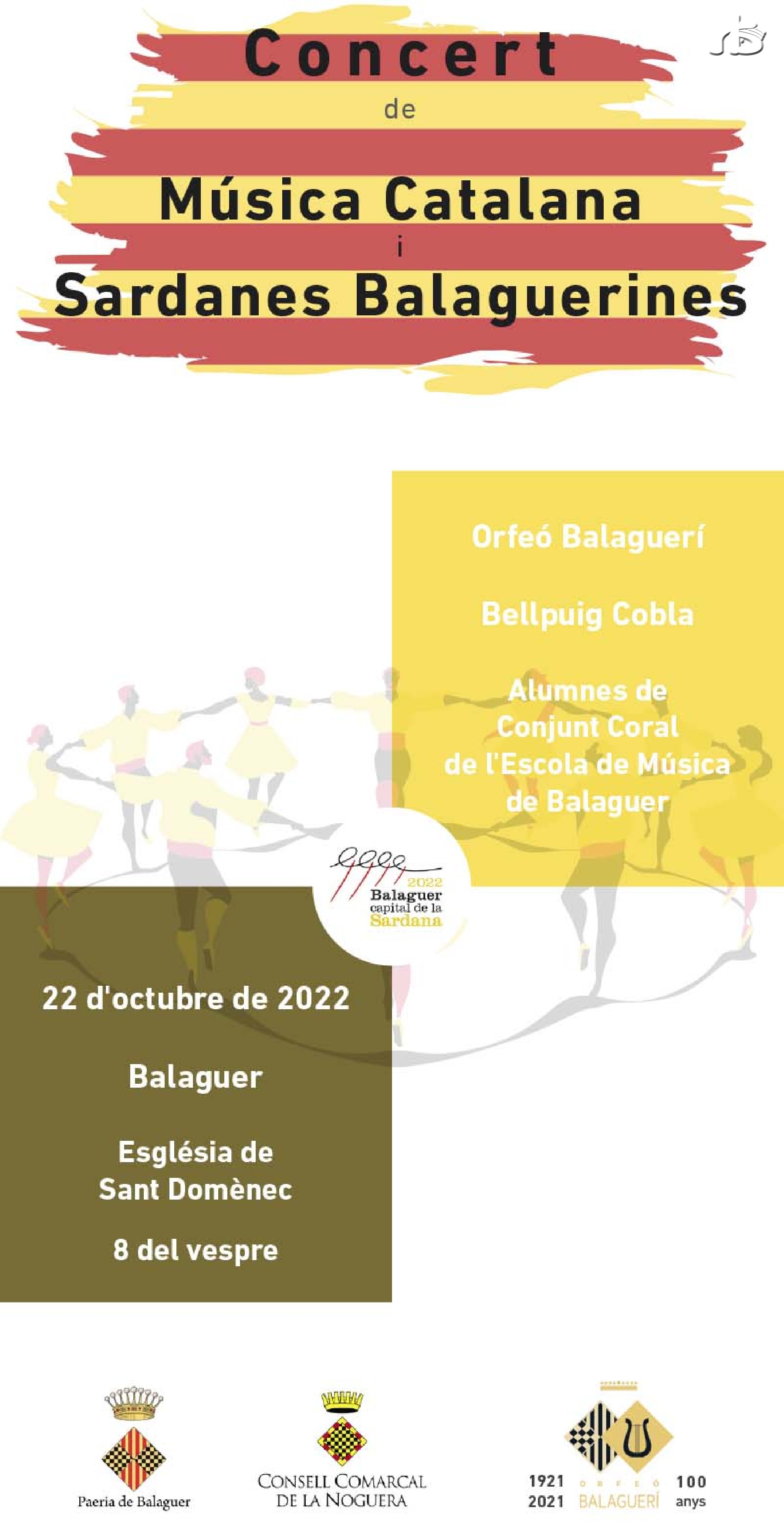 L'Orfeó Balaguerí ofereix aquest dissabte 22 d'octubre un concert extraordinari a l'església de Sant Domènec. Es tracta d'una actuació amb la qual l'Orfeó col·labora en els actes que se celebren a la ciutat en motiu de la Capitalitat de la Sardana