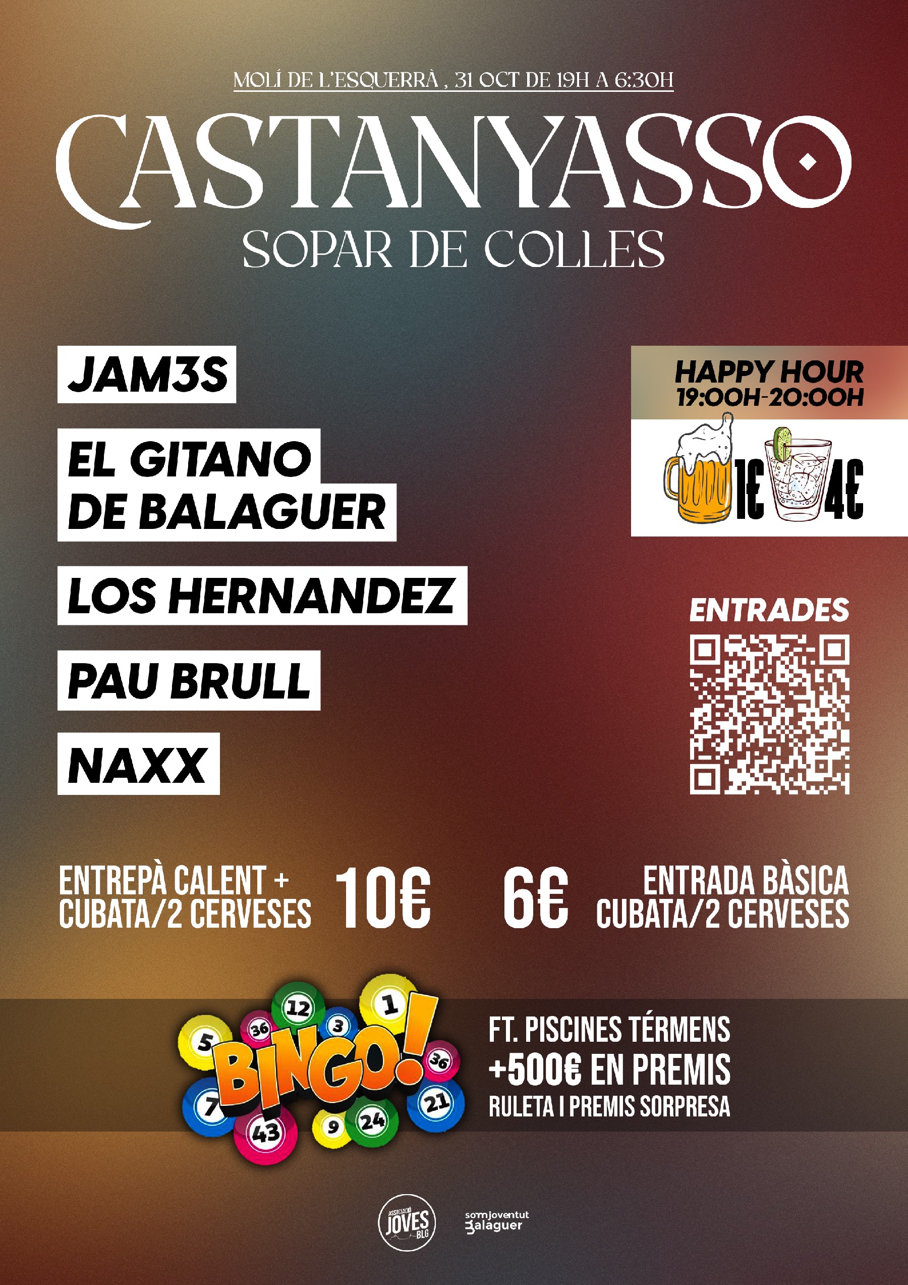 L'Associació Joves BLG celebra la seva particular castanyada el proper 31 d'octubre. Enguany, amb el nom de Castanyasso, la vetllada tornarà a comptar amb el ja tradicional Sopar de Colles, per al que cal reserva anticipada