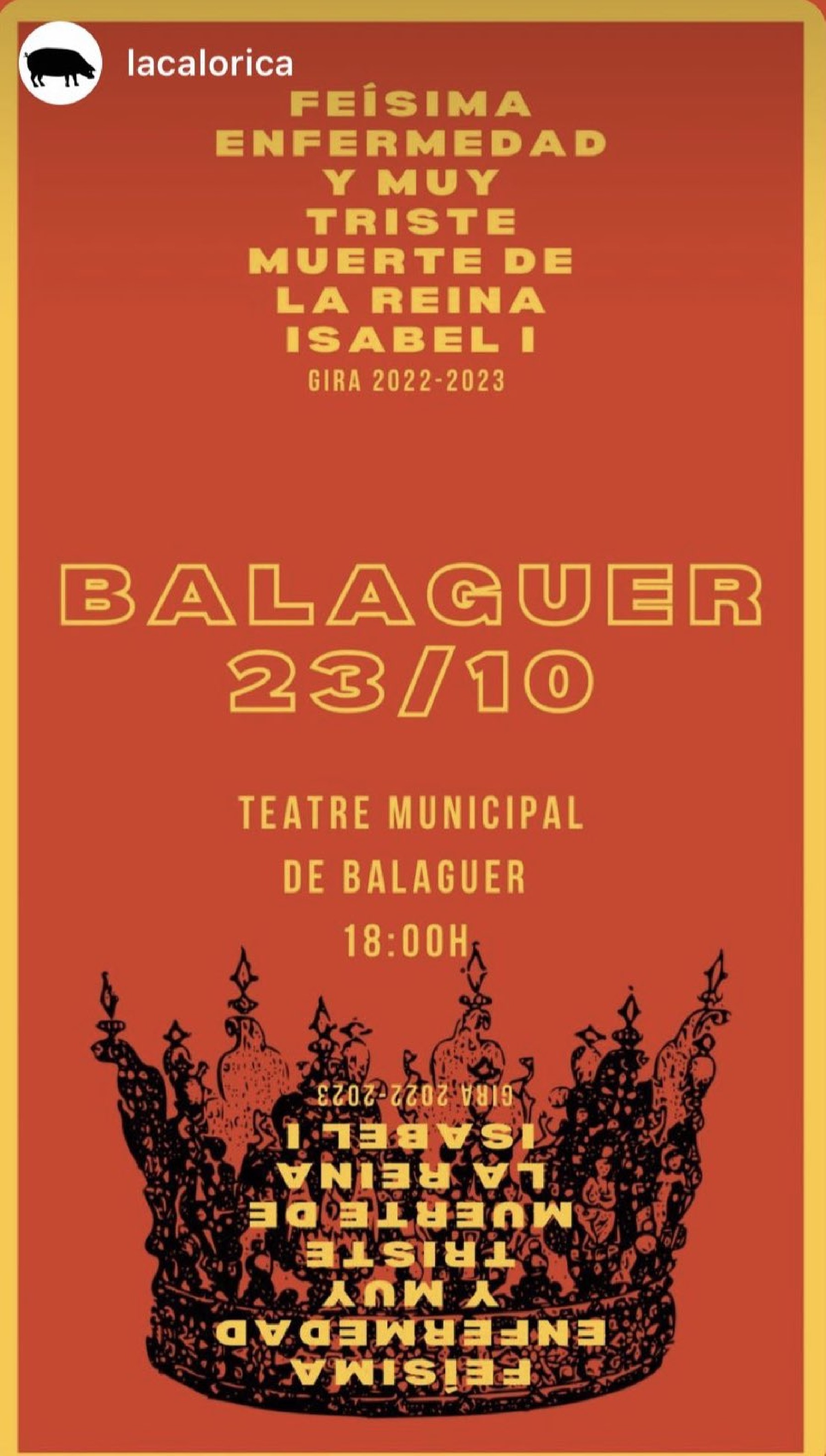 La companyia LA CALÒRICA, amb l'obra la FEÍSIMA ENFERMEDAD Y MUY TRISTE MUERTE DE LA REINA ISABEL I, serà l'obra que obrirà el cicle de tardor de la 24a temporada al Teatre Municipal de Balaguer el dia 23 d'octubre.