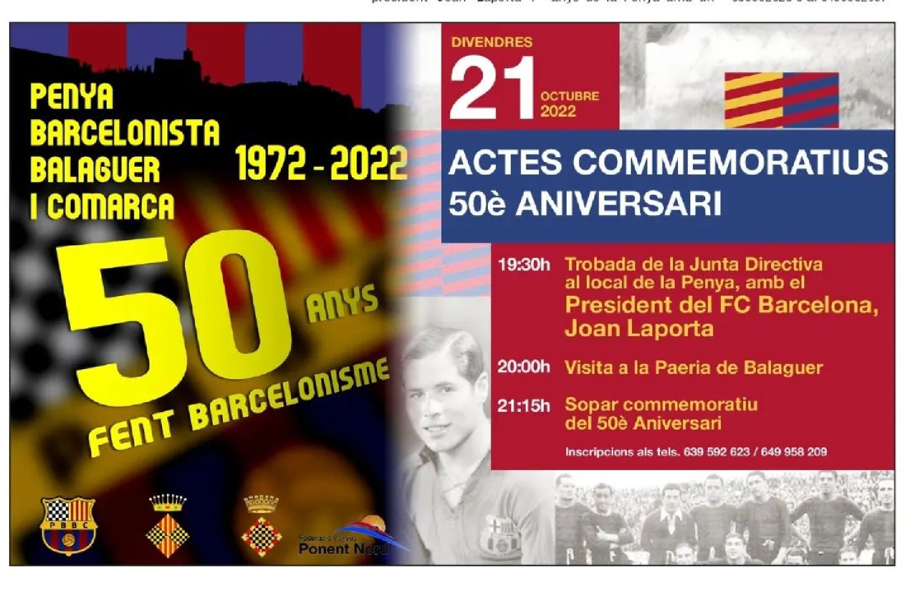 La Penya Barcelonista de Balaguer celebrarà l'acte central del seu 50è aniversari aquest divendres, amb la presència de la junta de FC Barcelona i el president Joan Laporta. També de les 3 copes del triplet