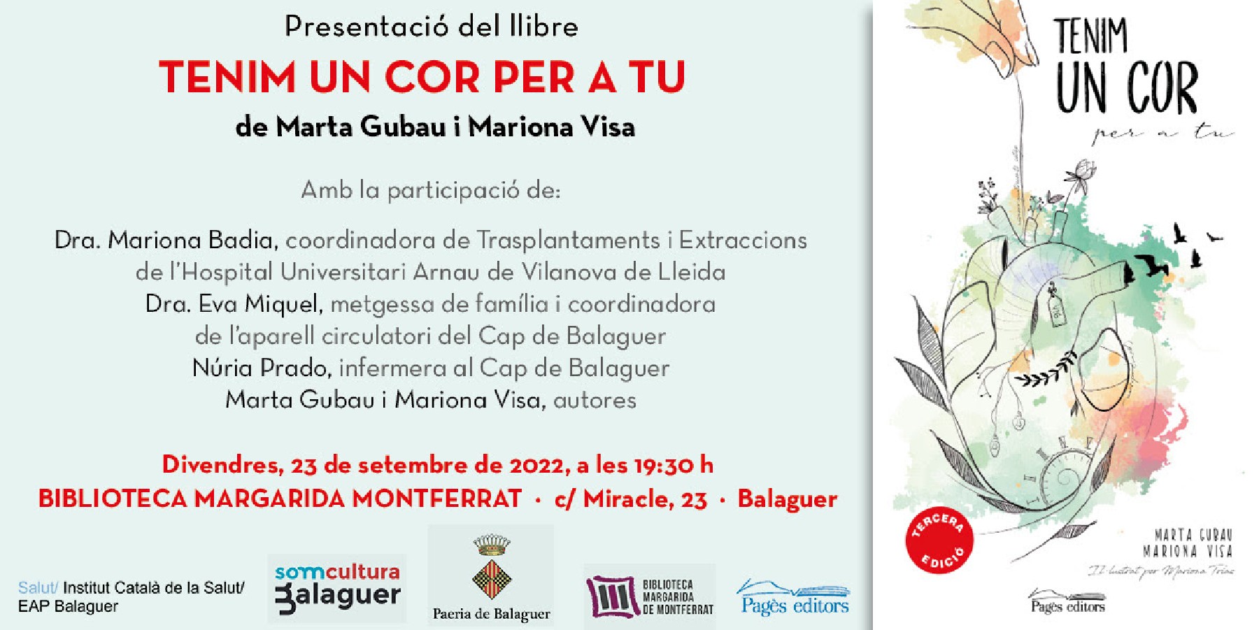 La Biblioteca Montferrat de Balaguer ha estat escenari aquest divendres de la presentació del llibre Tenim un cor per a tu' que narra l'experiència viscuda per Marta Gubau en primera persona, durant i després de rebre un trasplantament de cor