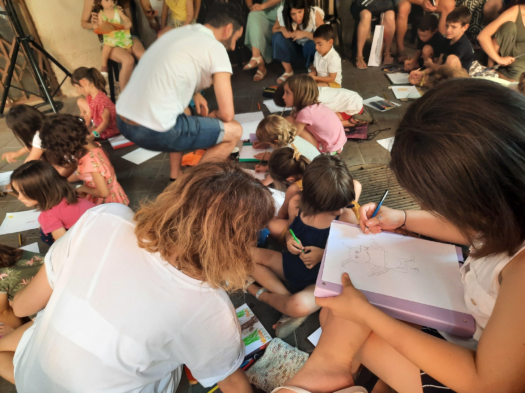 Els porxos de la plaça del Pou de Balaguer han acollit aquest dissabte un taller per a infants Animals del meu món' a càrrec de Vero Gatti i Guido Ferro, autors del cartell de l'Encontats d'enguany