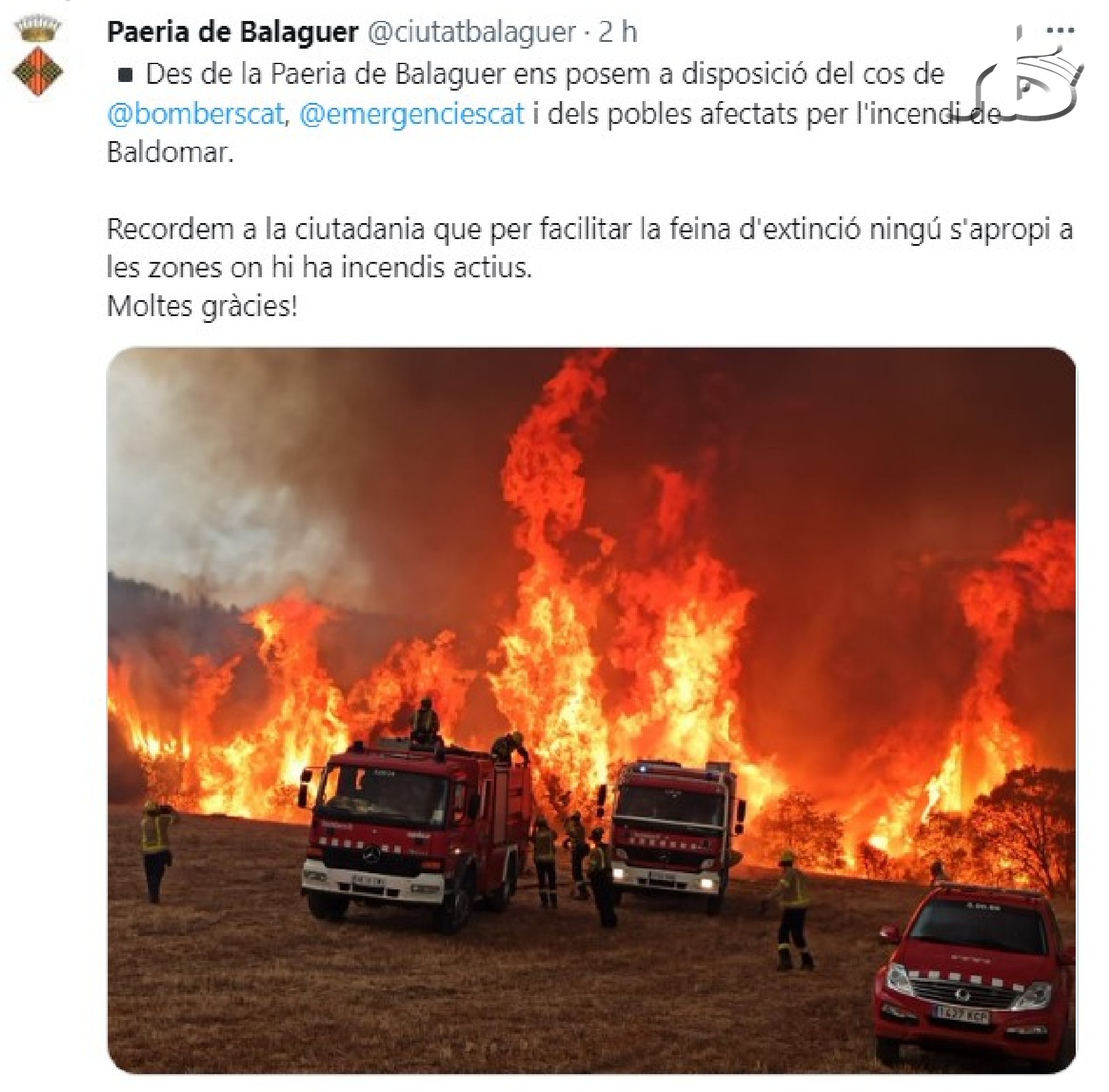 La Paeria es posa a disposició de Bombers, Protecció Civil i municipis afectats per l'incendi d'Artesa de Segre per si cal habilitar pavellons o altres instal·lacions en cas que sigui necessari acollir veïns afectats pel foc o personal d'emergències