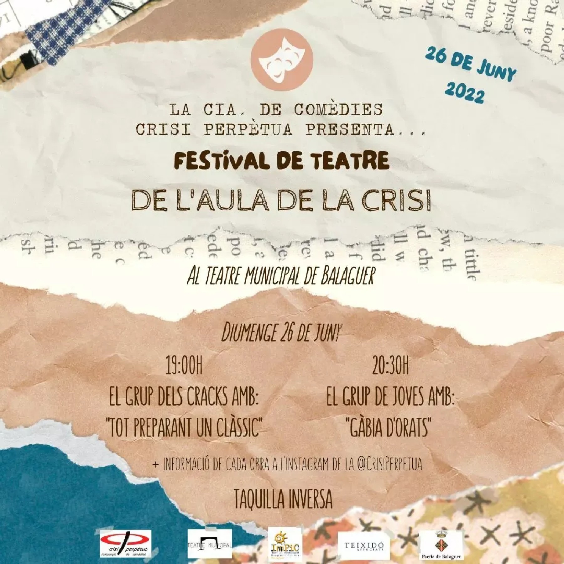 L'Aula de la Crisi Perpètua realitzarà el proper diumenge 26 de juny dues funcions al Teatre Municipal de Balaguer: Tot preparant un clàssic i Gàbia d'Orats, dirigides MIREIA FREIXAS, directora de l'aula de la Crisi