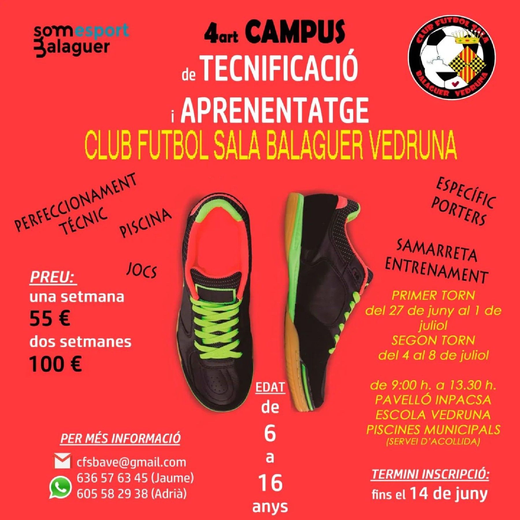 El Club Vedruna Balaguer de futbol sala realitza el 4t Campus de Tecnificació i aprenentatge. Es tracta d'una activitat adreçada a infants interessats en el món del futbol sala i que es realitzarà en dos torns del 27 de juny al 8 de juliol