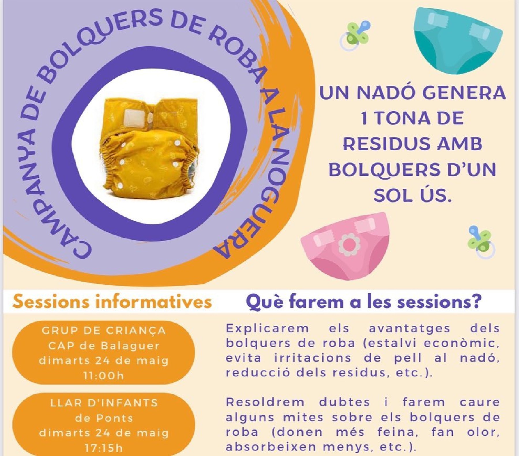 Aquest dimarts han tingut lloc les primeres les sessions informatives de la campanya per l'ús de bolquers de roba a la comarca de la Noguera. S'han fet al grup de criança del Cap de Balaguer